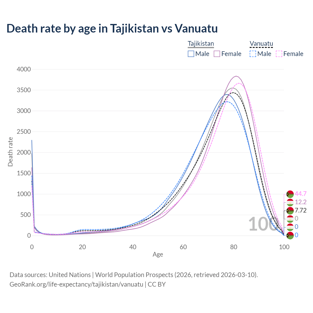 This life expectancy calculator shows the odds of living to 100, 95, 90, and below based on current age for both males and females in Tajikistan and Vanuatu, along with mean and median age of death. The calculations are based on the 2026 life tables (actuarial tables) from the UN World Population Prospects.
