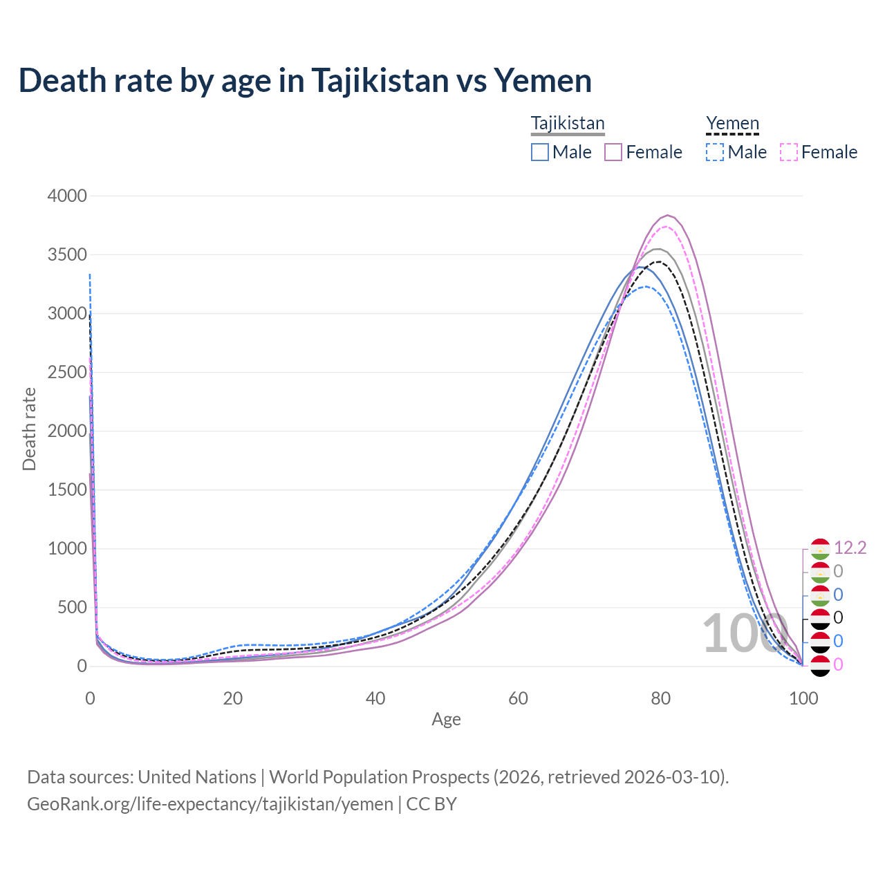 In Tajikistan, the most common age of death is 80, compared to 80 in Yemen. The median age of death is 76 in Tajikistan and 74.9 in Yemen, meaning only half of each cohort is expected to live past that age.