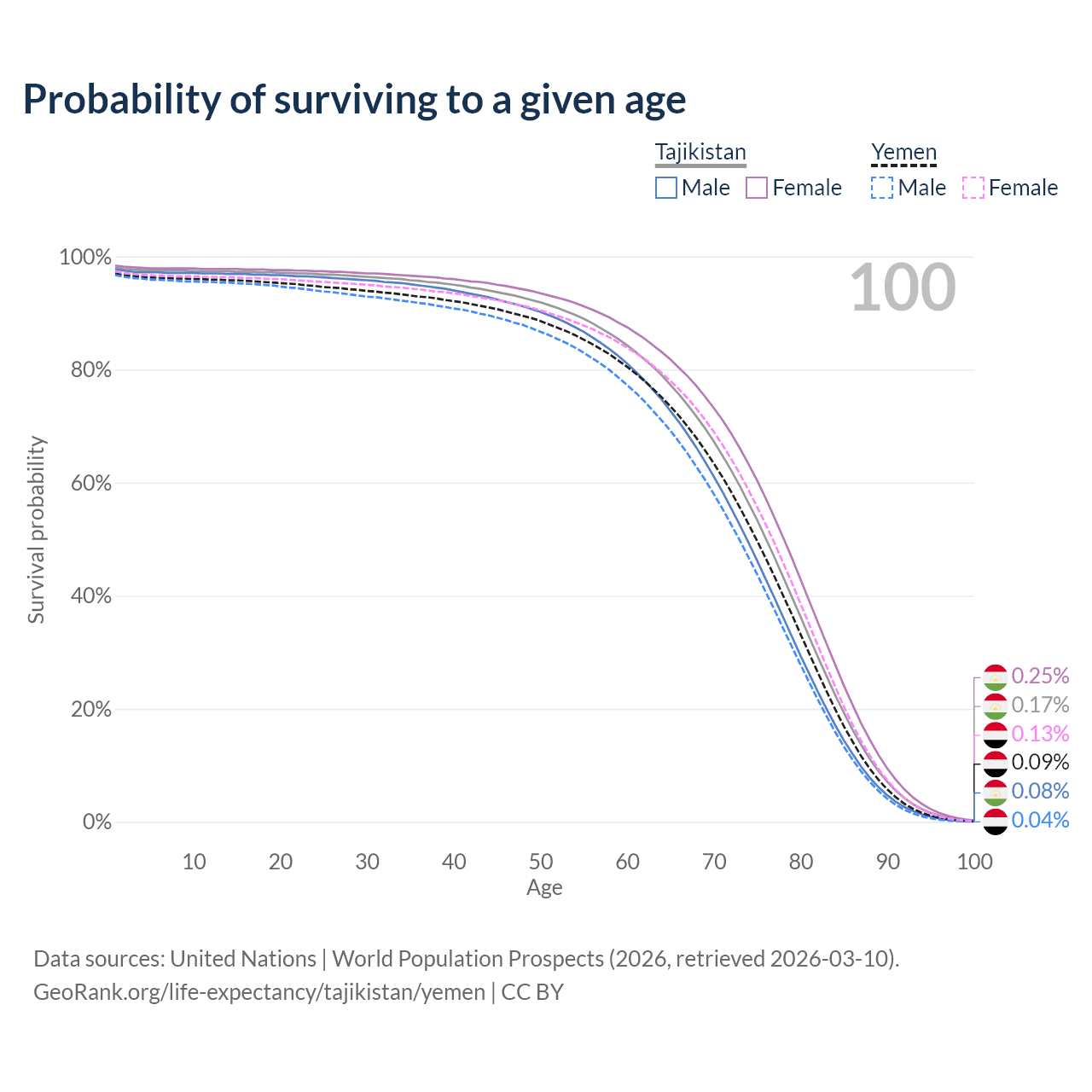 This life expectancy calculator shows the odds of living to 100, 95, 90, and below based on current age for both males and females in Tajikistan and Yemen, along with mean and median age of death. The calculations are based on the 2026 life tables (actuarial tables) from the UN World Population Prospects.