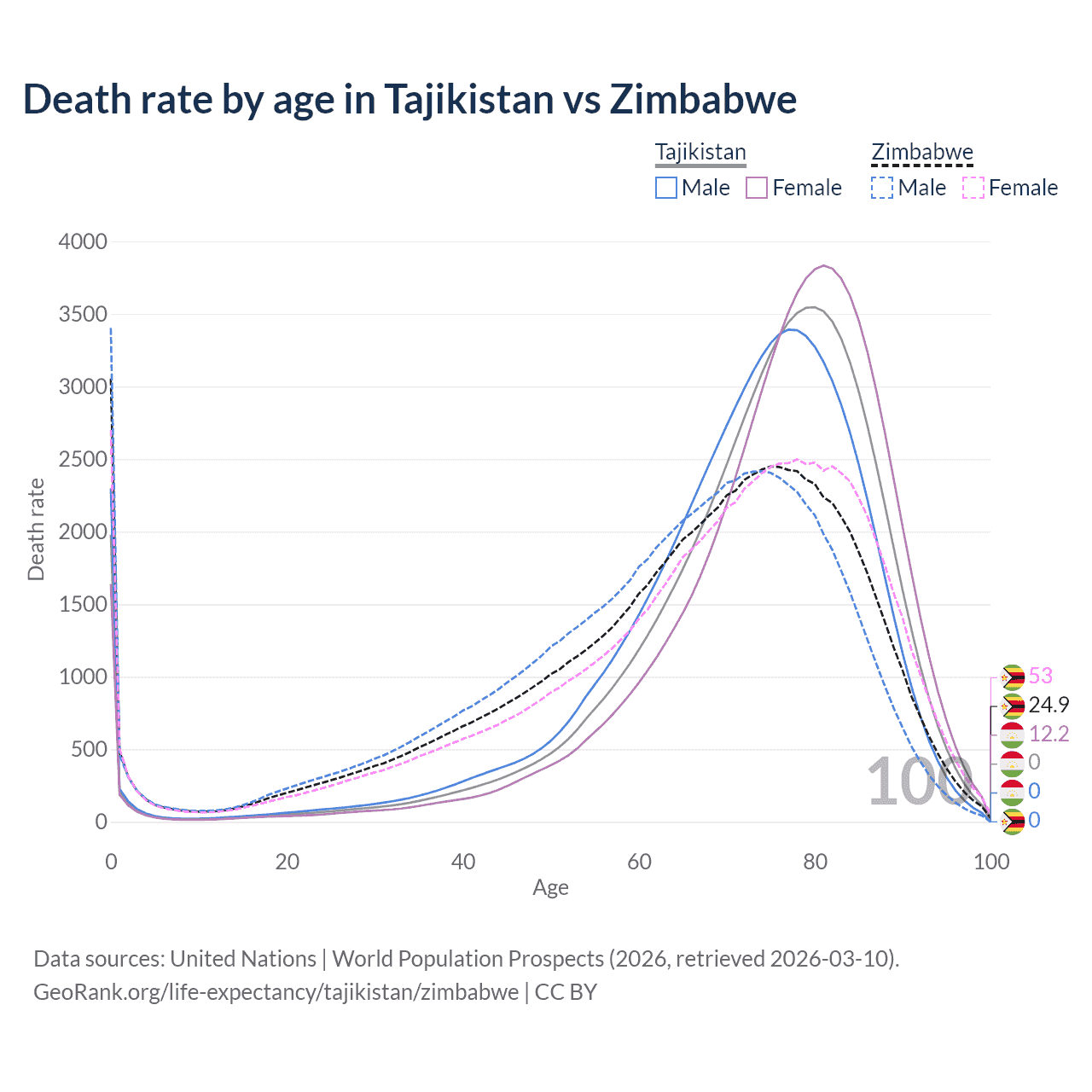 In Tajikistan, the most common age of death is 80, compared to 0 in Zimbabwe. The median age of death is 76 in Tajikistan and 68.8 in Zimbabwe, meaning only half of each cohort is expected to live past that age.