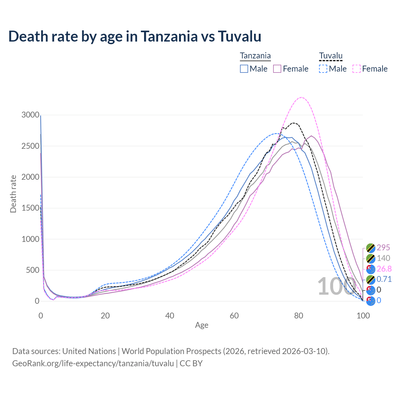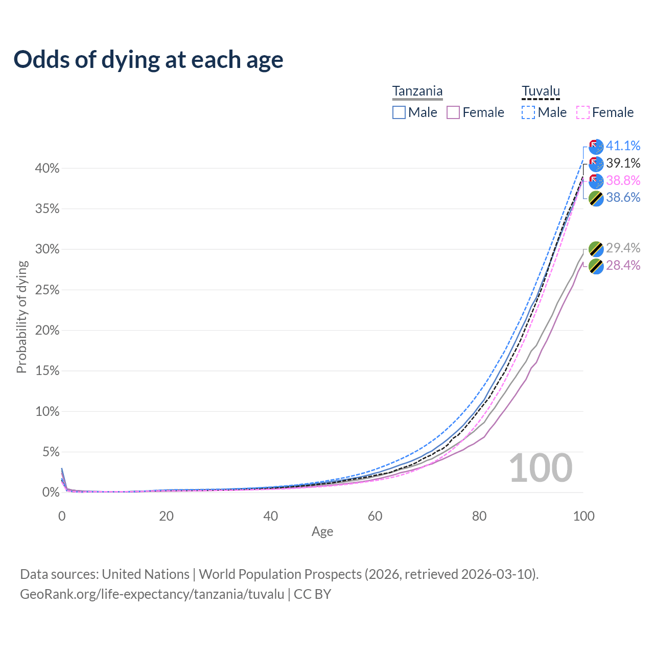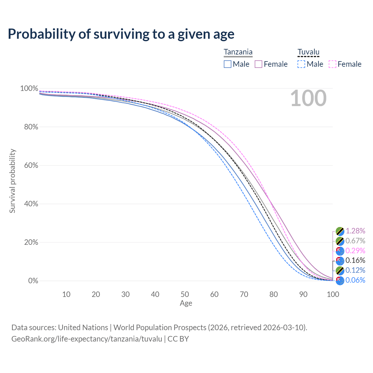This life expectancy calculator shows the odds of living to 100, 95, 90, and below based on current age for both males and females in Tanzania and Tuvalu, along with mean and median age of death. The calculations are based on the 2026 life tables (actuarial tables) from the UN World Population Prospects.