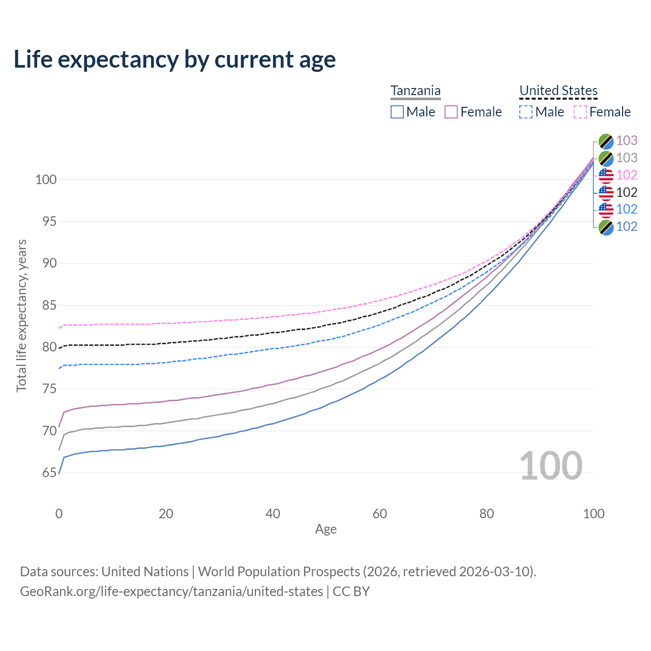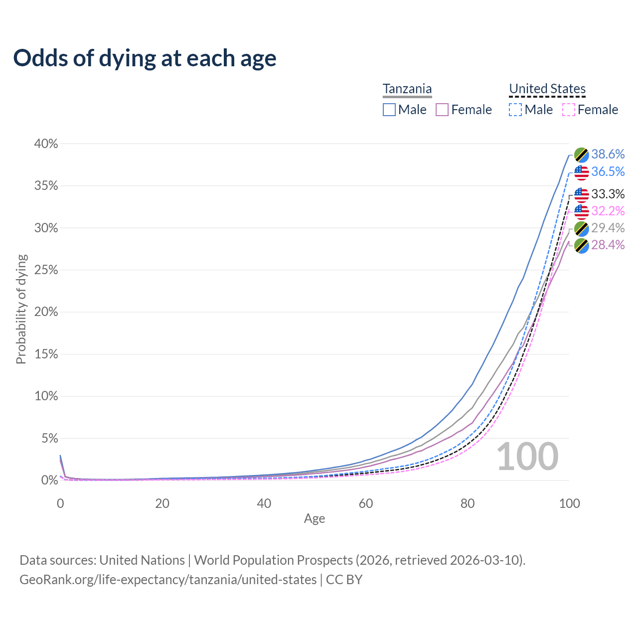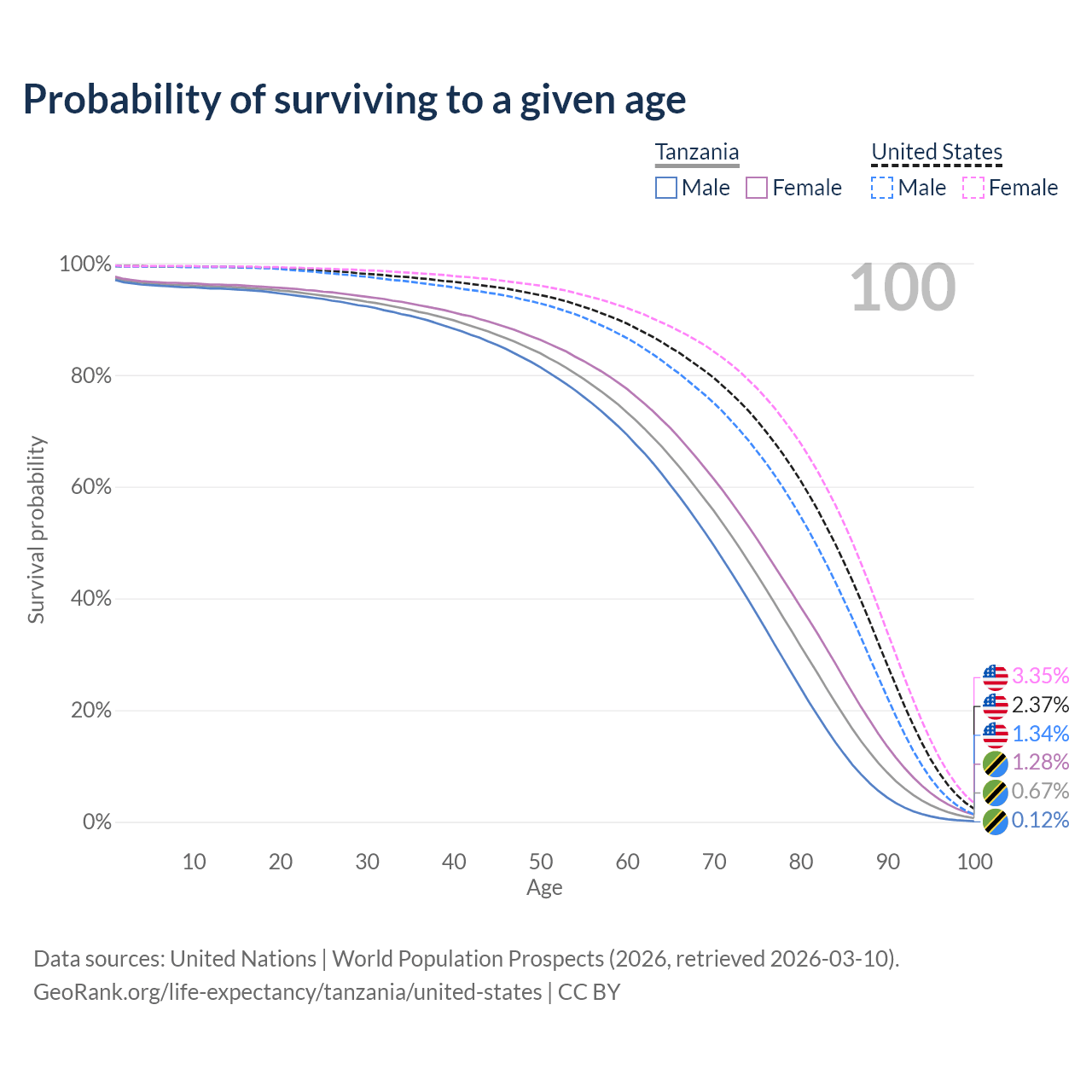 This life expectancy calculator shows the odds of living to 100, 95, 90, and below based on current age for both males and females in Tanzania and the United States, along with mean and median age of death. The calculations are based on the 2026 life tables (actuarial tables) from the UN World Population Prospects.