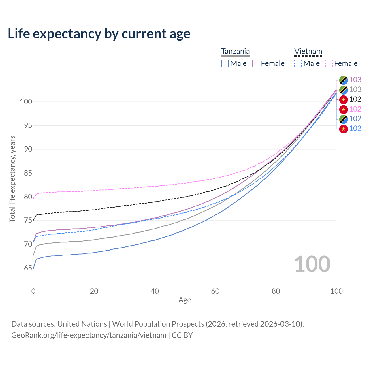 This life expectancy calculator shows the odds of living to 100, 95, 90, and below based on current age for both males and females in Tanzania and Vietnam, along with mean and median age of death. The calculations are based on the 2026 life tables (actuarial tables) from the UN World Population Prospects.