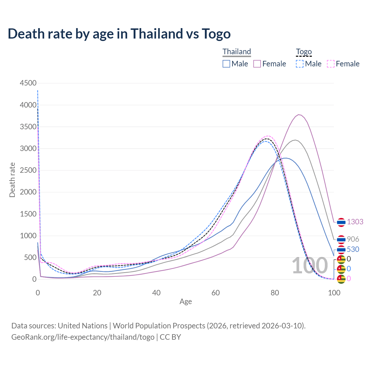 In Thailand, the most common age of death is 87, compared to 0 in Togo. The median age of death is 81.8 in Thailand and 71 in Togo, meaning only half of each cohort is expected to live past that age.