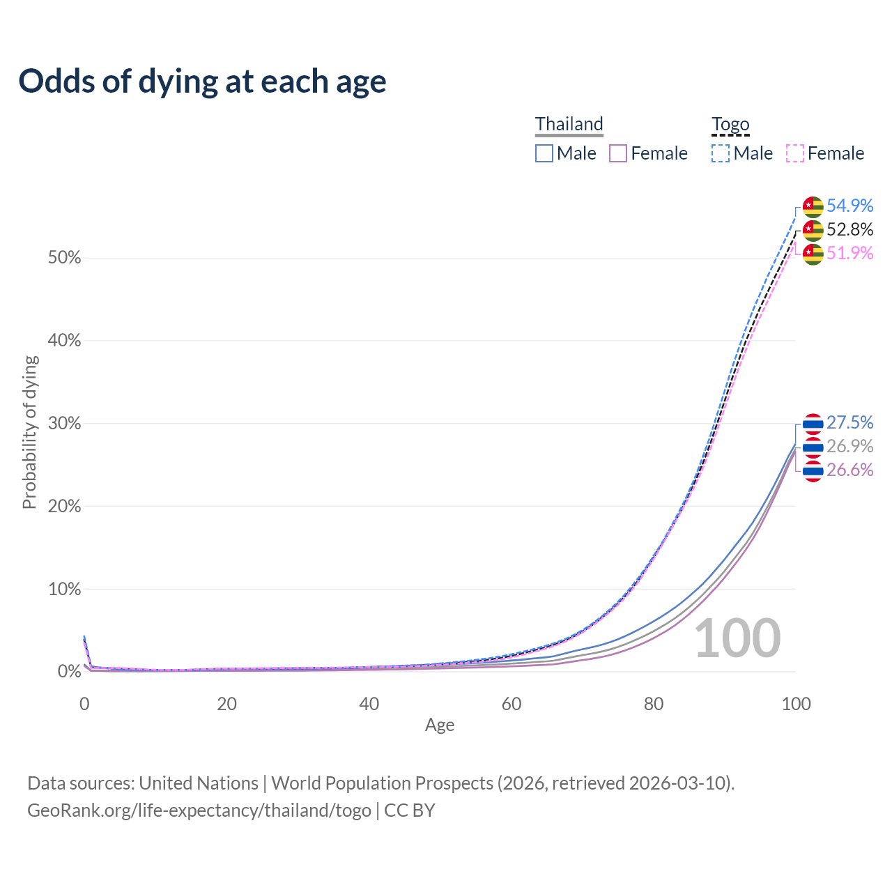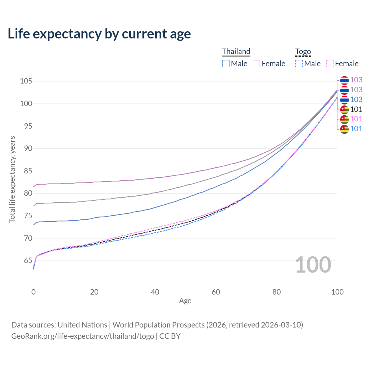 This life expectancy calculator shows the odds of living to 100, 95, 90, and below based on current age for both males and females in Thailand and Togo, along with mean and median age of death. The calculations are based on the 2026 life tables (actuarial tables) from the UN World Population Prospects.