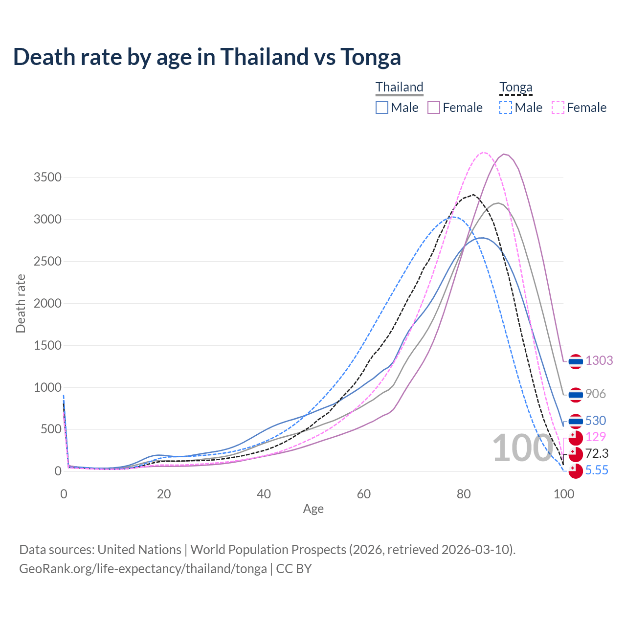 This life expectancy calculator shows the odds of living to 100, 95, 90, and below based on current age for both males and females in Thailand and Tonga, along with mean and median age of death. The calculations are based on the 2026 life tables (actuarial tables) from the UN World Population Prospects.