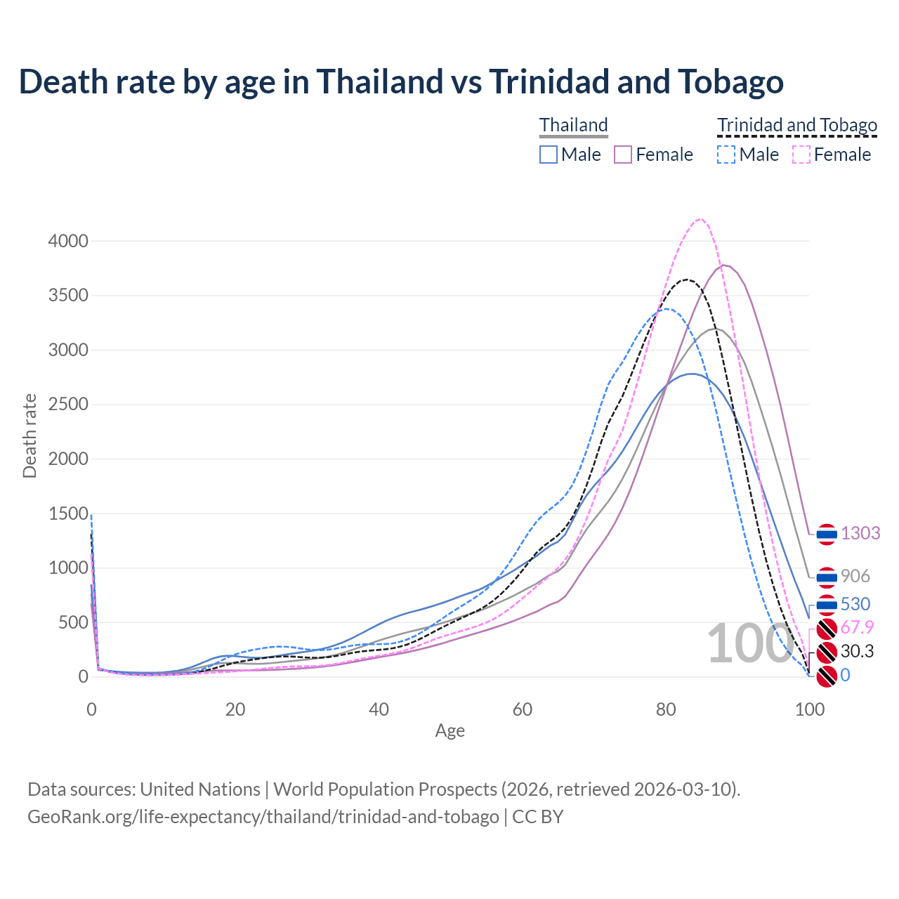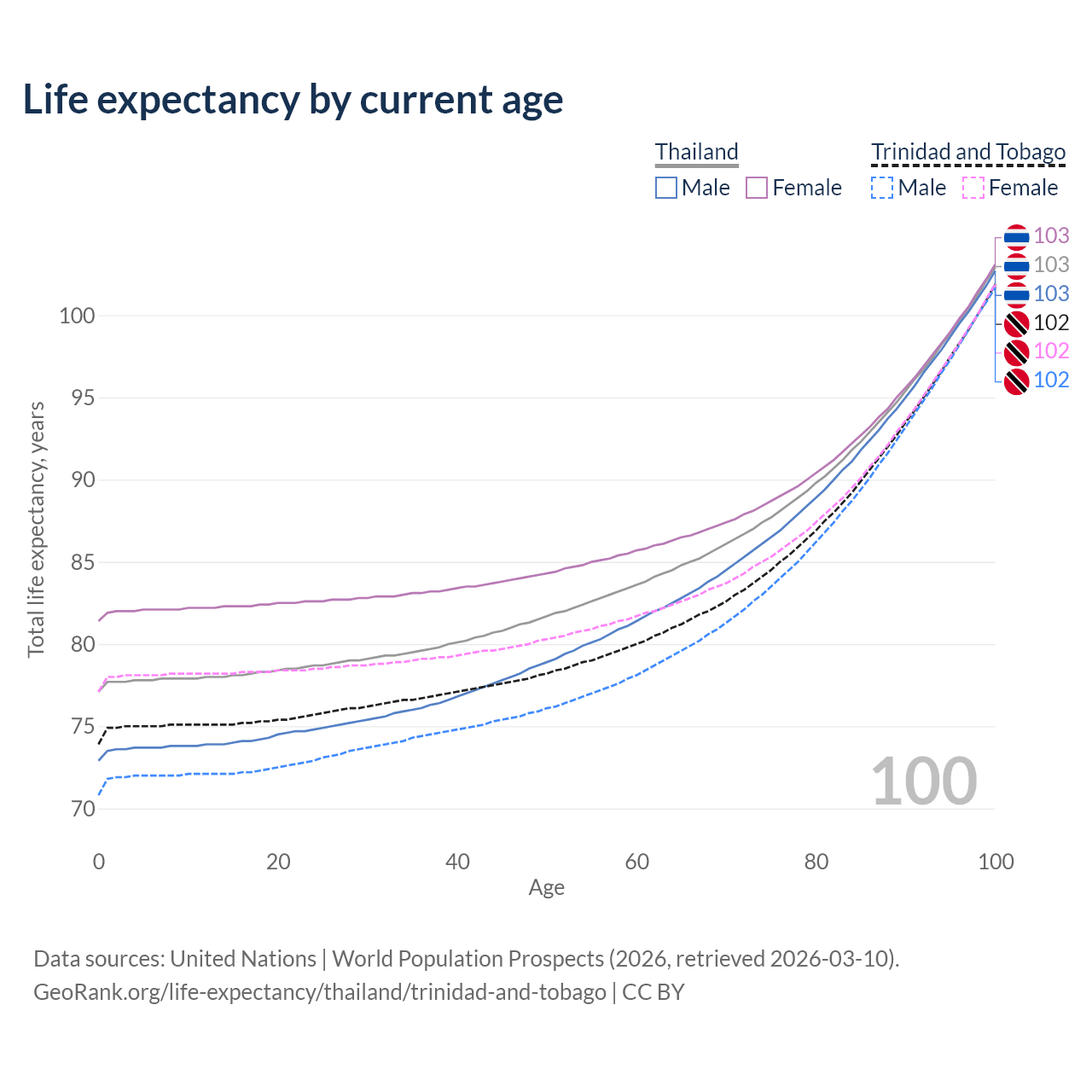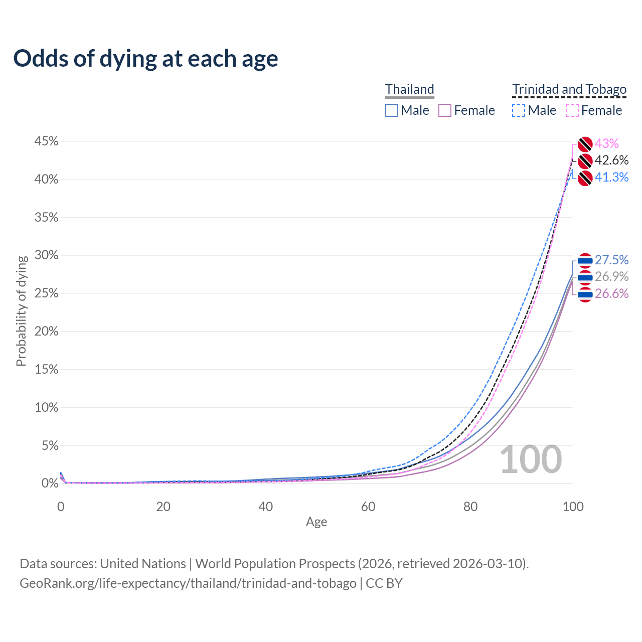 This life expectancy calculator shows the odds of living to 100, 95, 90, and below based on current age for both males and females in Thailand and Trinidad and Tobago, along with mean and median age of death. The calculations are based on the 2026 life tables (actuarial tables) from the UN World Population Prospects.