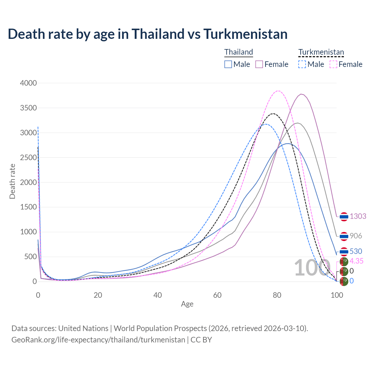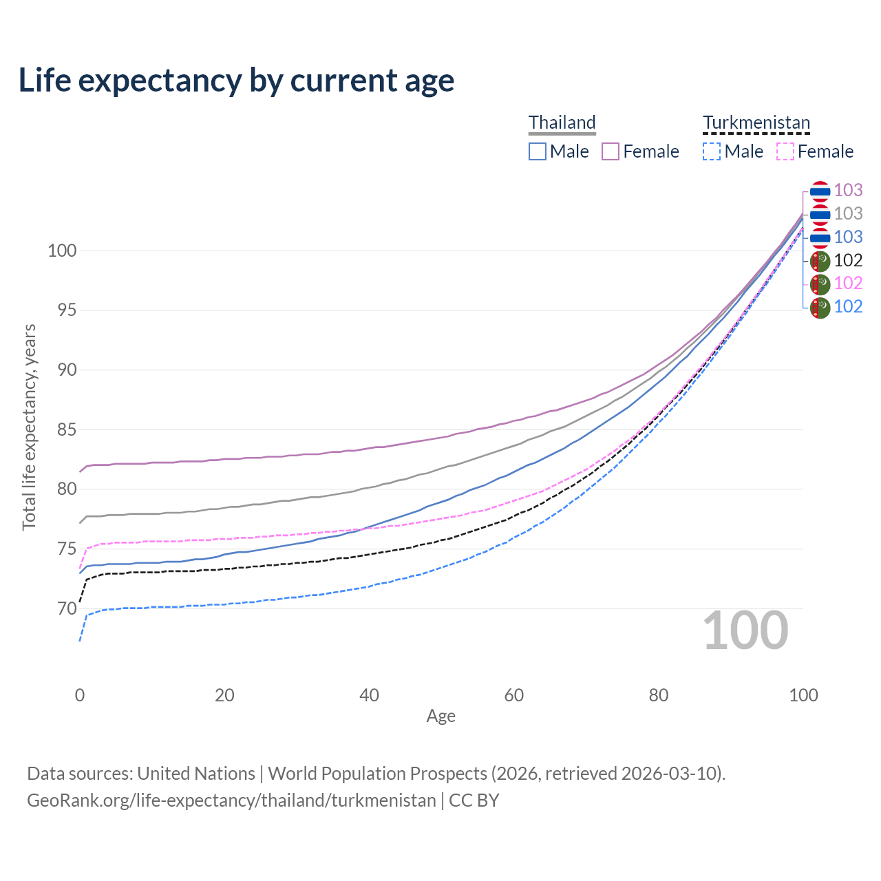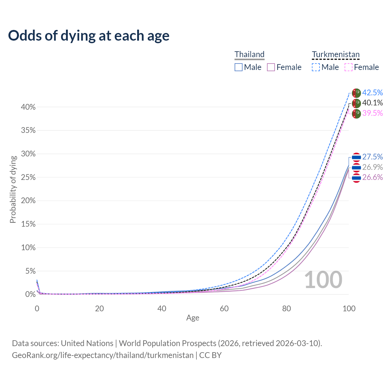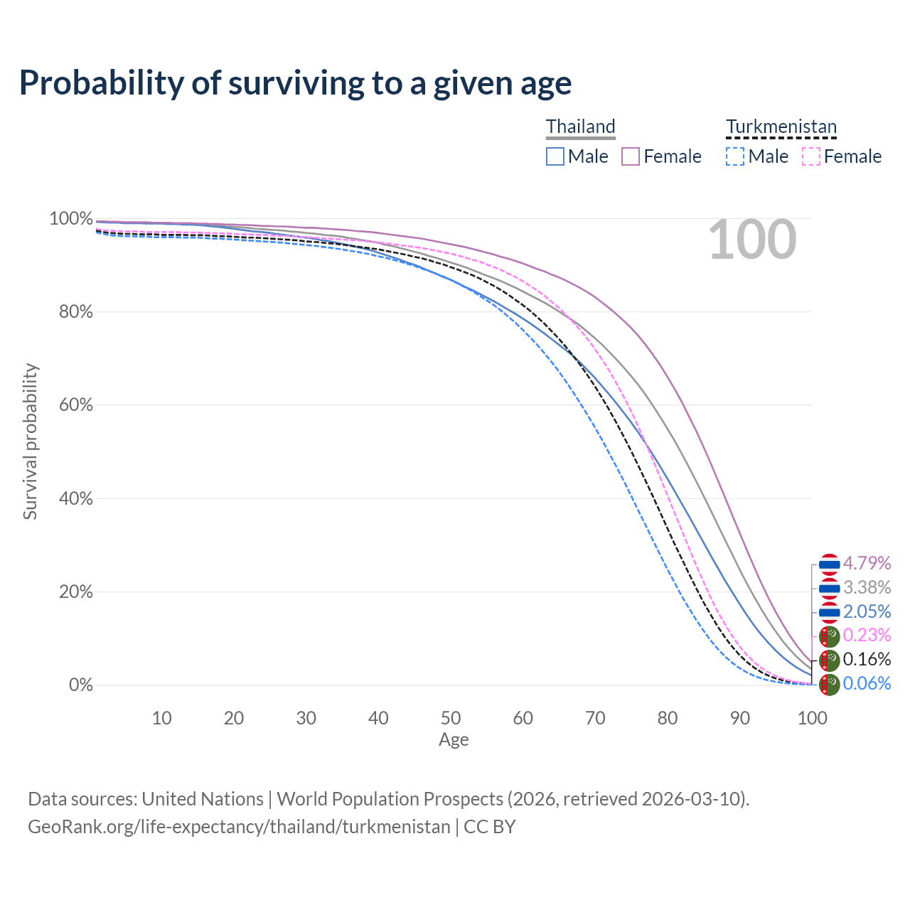 This life expectancy calculator shows the odds of living to 100, 95, 90, and below based on current age for both males and females in Thailand and Turkmenistan, along with mean and median age of death. The calculations are based on the 2026 life tables (actuarial tables) from the UN World Population Prospects.
