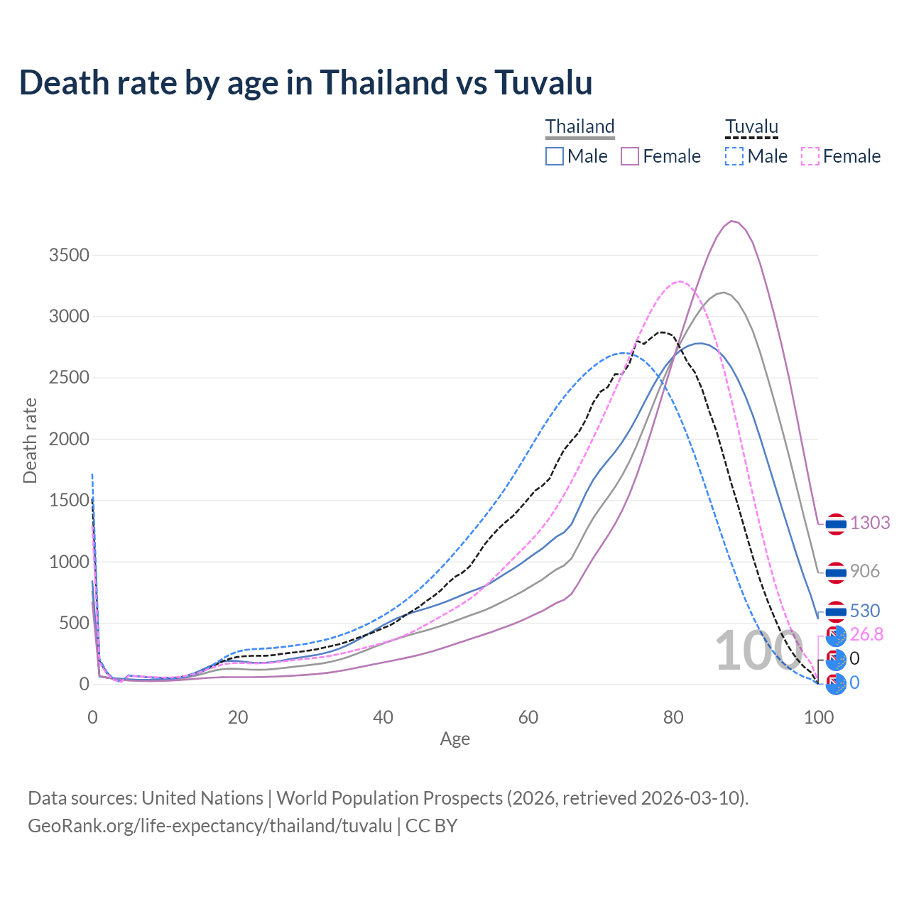 In Thailand, the most common age of death is 87, compared to 78 in Tuvalu. The median age of death is 81.8 in Thailand and 71.9 in Tuvalu, meaning only half of each cohort is expected to live past that age.
