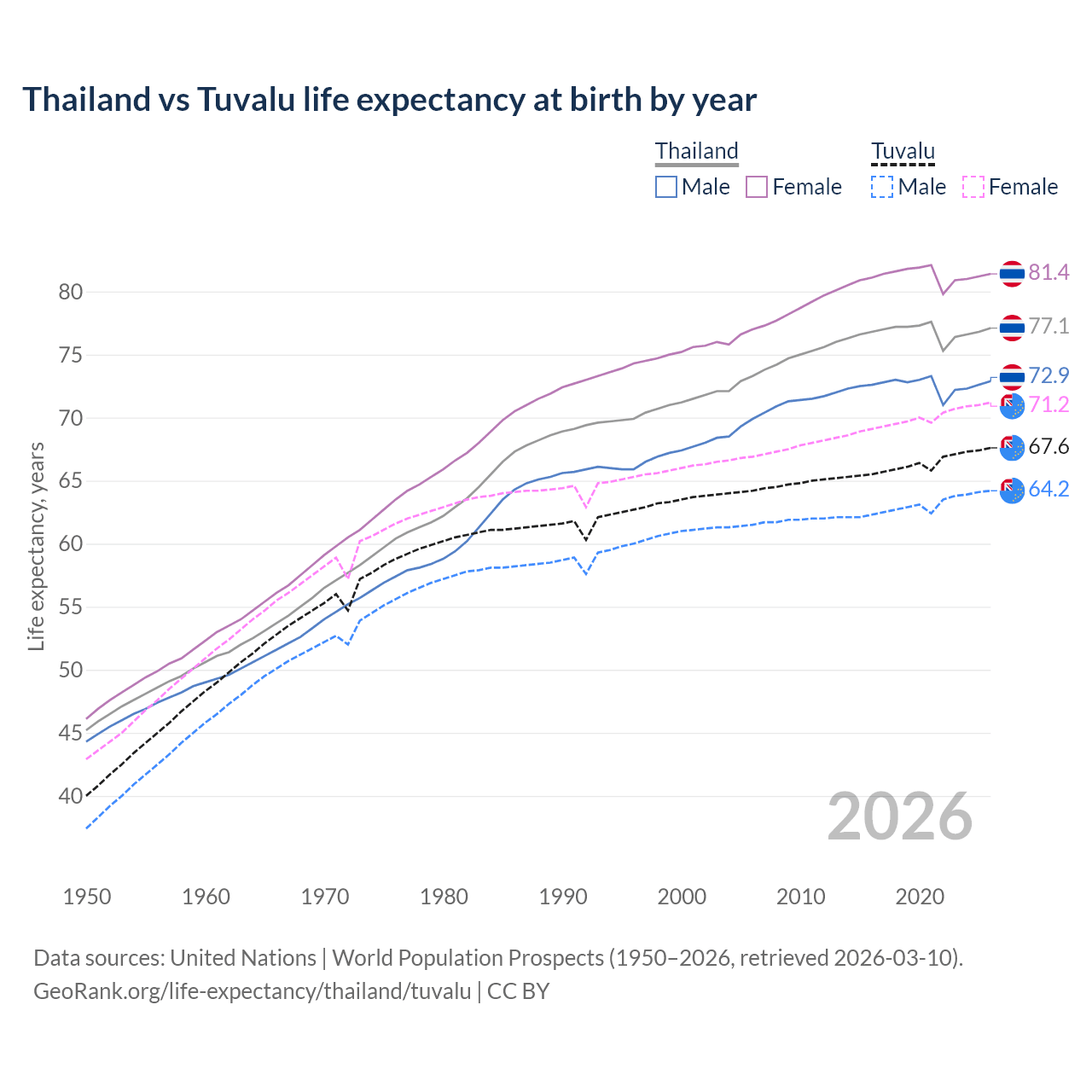 The average life expectancy at birth is 77.1 years in Thailand vs 67.6 in Tuvalu. Thailand is ranked 75/197 by life expectancy, and Tuvalu is 156/197. In Thailand, the life expectancy is 72.9 years for males and 81.4 years for females. In Tuvalu, it's 64.2 years for males and 71.2 years for females.