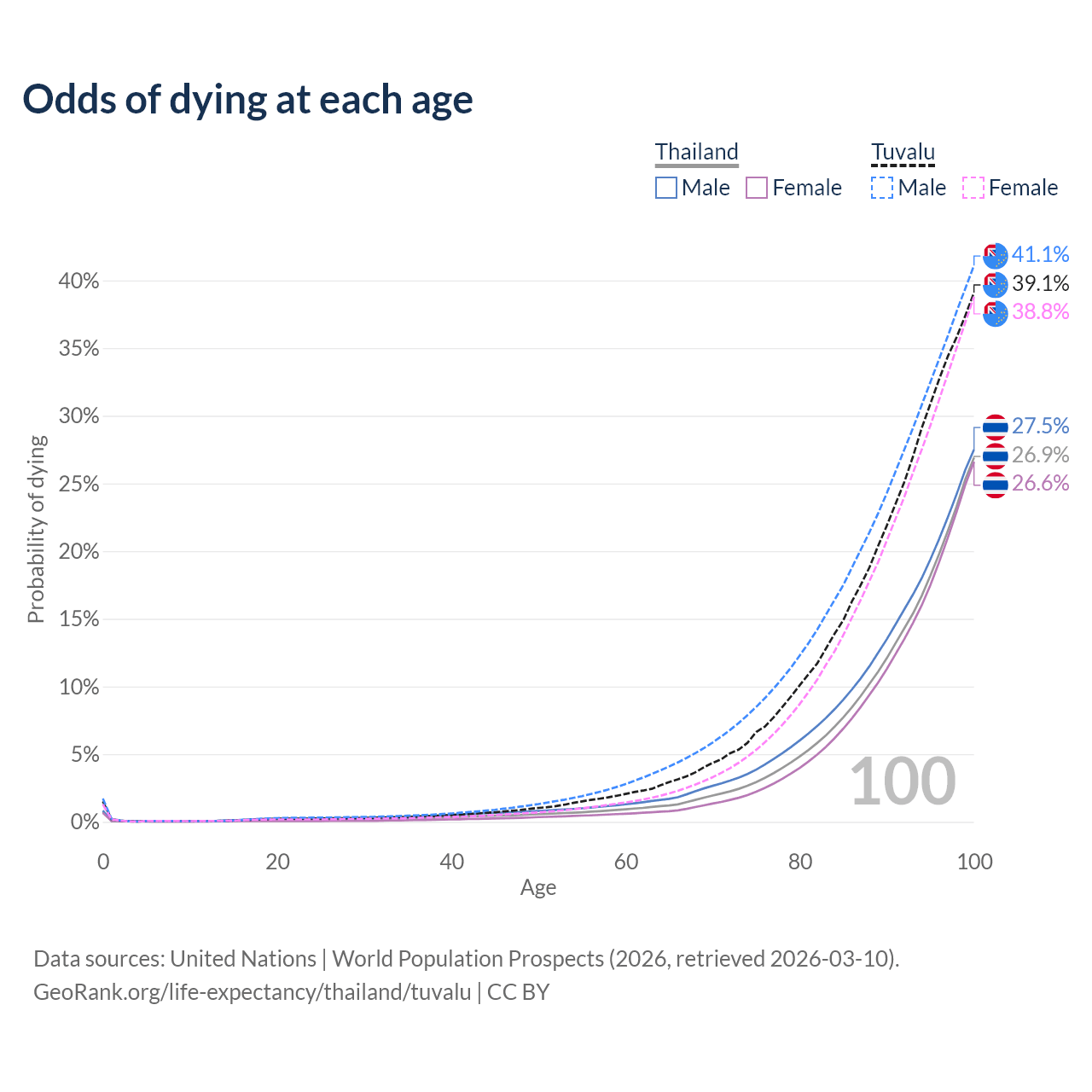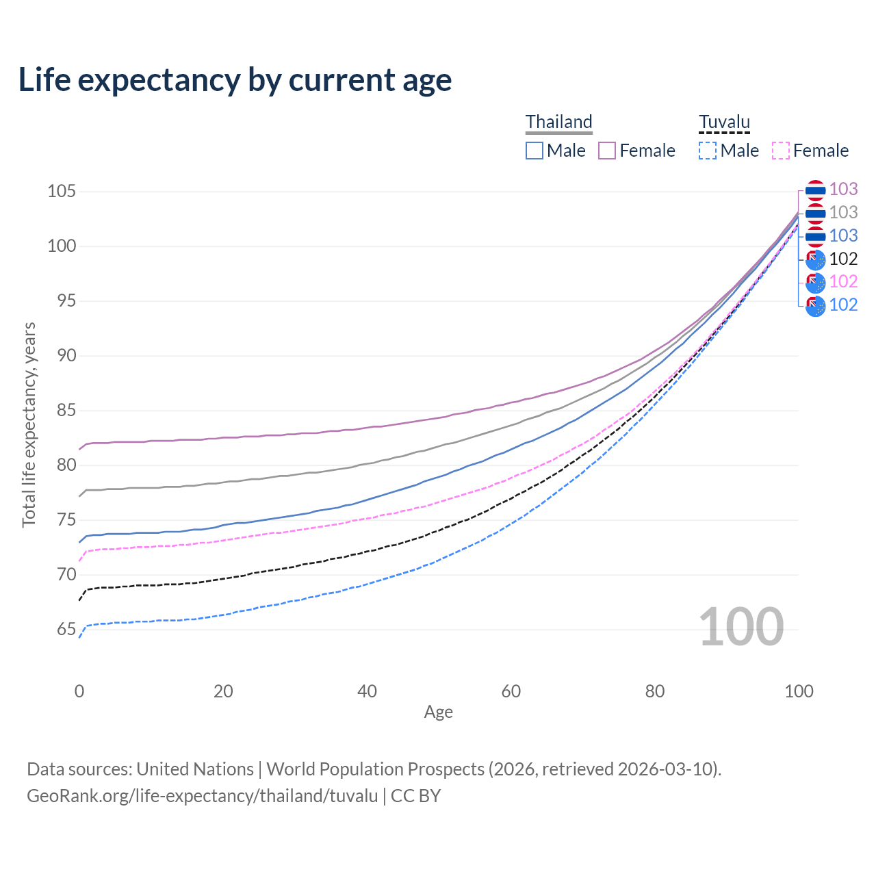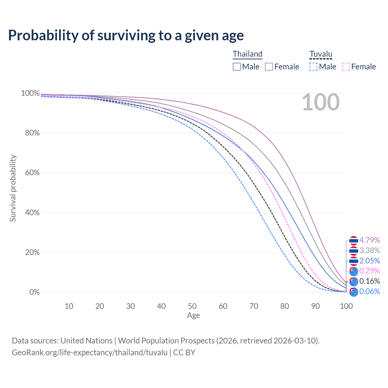 This life expectancy calculator shows the odds of living to 100, 95, 90, and below based on current age for both males and females in Thailand and Tuvalu, along with mean and median age of death. The calculations are based on the 2026 life tables (actuarial tables) from the UN World Population Prospects.