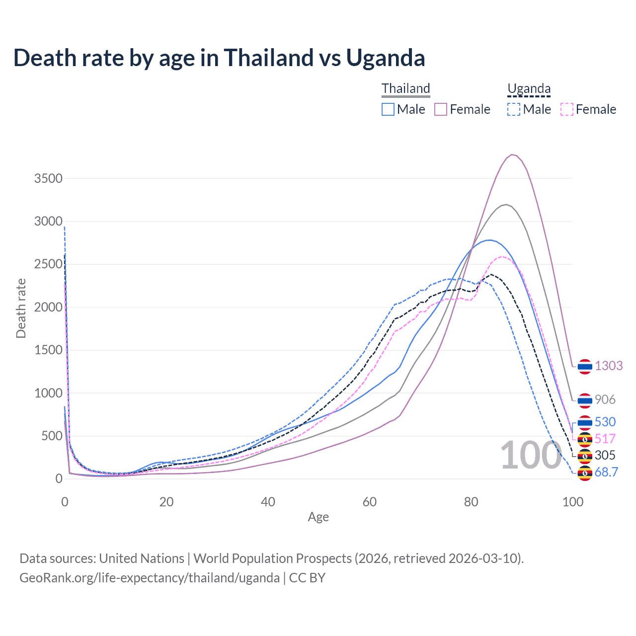 In Thailand, the most common age of death is 87, compared to 0 in Uganda. The median age of death is 81.8 in Thailand and 73.3 in Uganda, meaning only half of each cohort is expected to live past that age.
