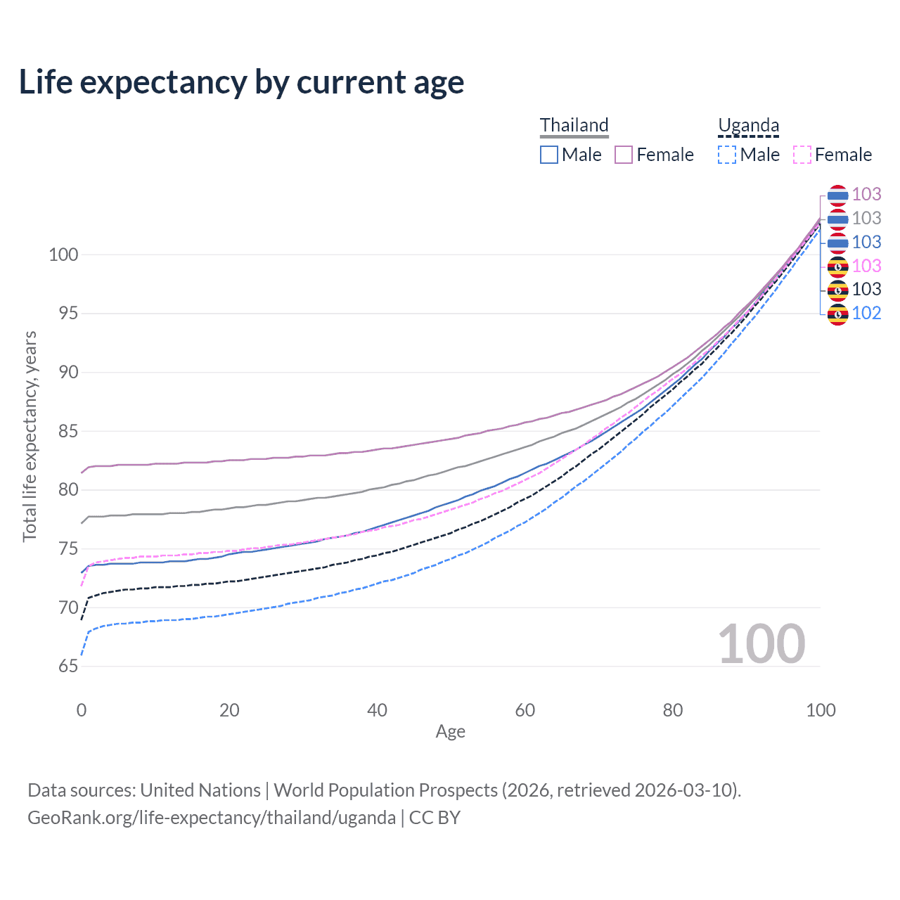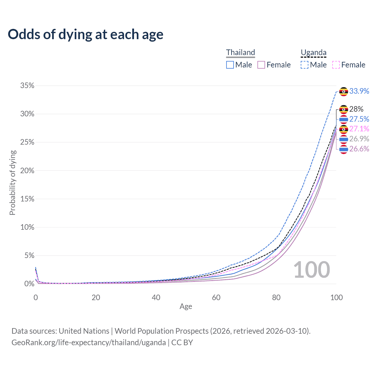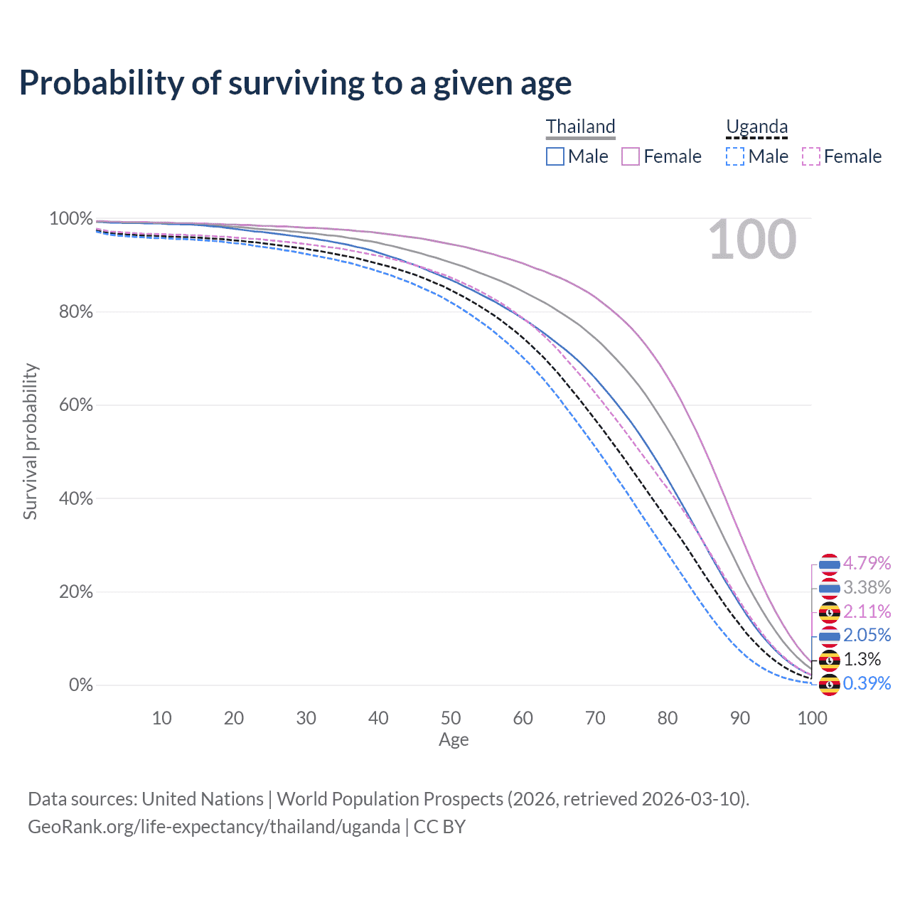 This life expectancy calculator shows the odds of living to 100, 95, 90, and below based on current age for both males and females in Thailand and Uganda, along with mean and median age of death. The calculations are based on the 2026 life tables (actuarial tables) from the UN World Population Prospects.
