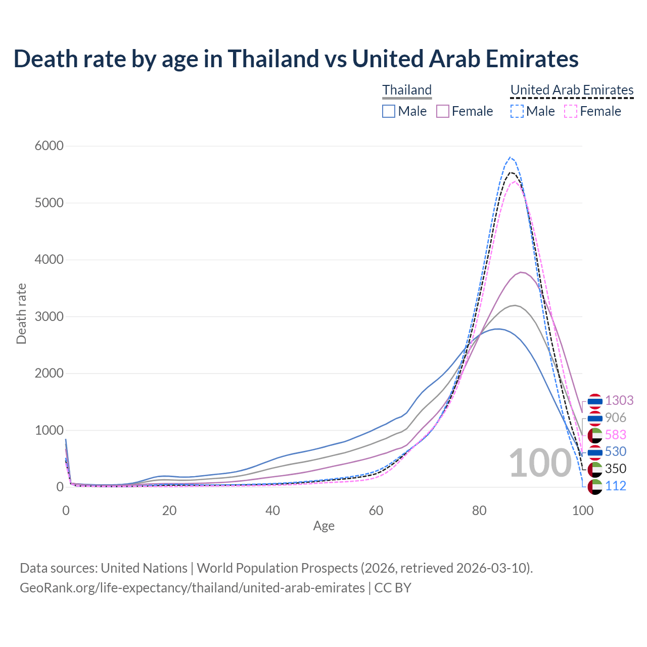 In Thailand, the most common age of death is 87, compared to 86 in the United Arab Emirates. The median age of death is 81.8 in Thailand and 85.6 in the United Arab Emirates, meaning only half of each cohort is expected to live past that age.