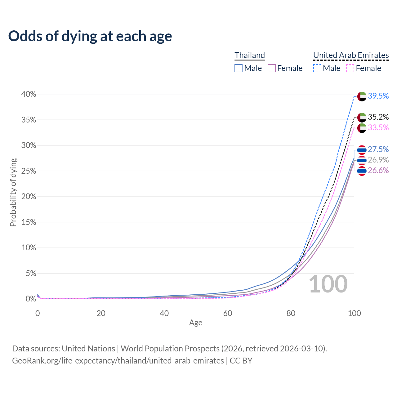 This life expectancy calculator shows the odds of living to 100, 95, 90, and below based on current age for both males and females in Thailand and the United Arab Emirates, along with mean and median age of death. The calculations are based on the 2026 life tables (actuarial tables) from the UN World Population Prospects.