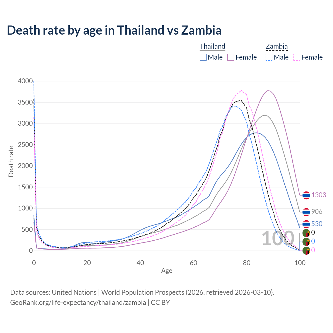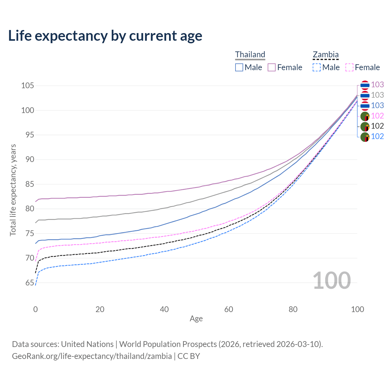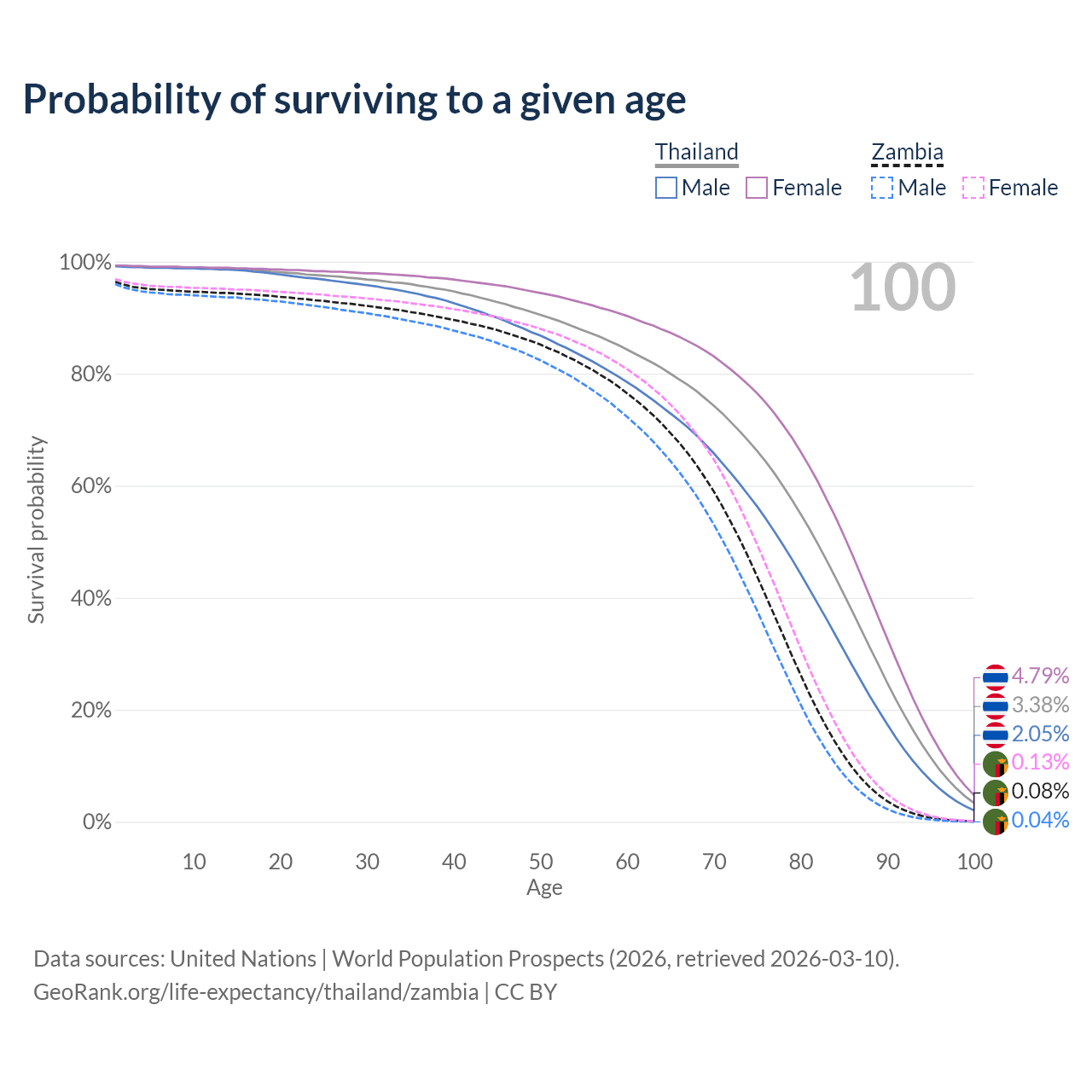 This life expectancy calculator shows the odds of living to 100, 95, 90, and below based on current age for both males and females in Thailand and Zambia, along with mean and median age of death. The calculations are based on the 2026 life tables (actuarial tables) from the UN World Population Prospects.