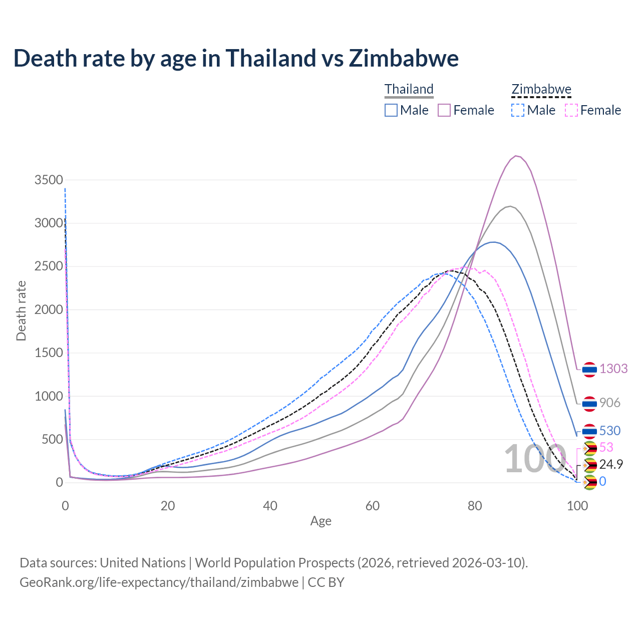 In Thailand, the most common age of death is 87, compared to 0 in Zimbabwe. The median age of death is 81.8 in Thailand and 68.8 in Zimbabwe, meaning only half of each cohort is expected to live past that age.