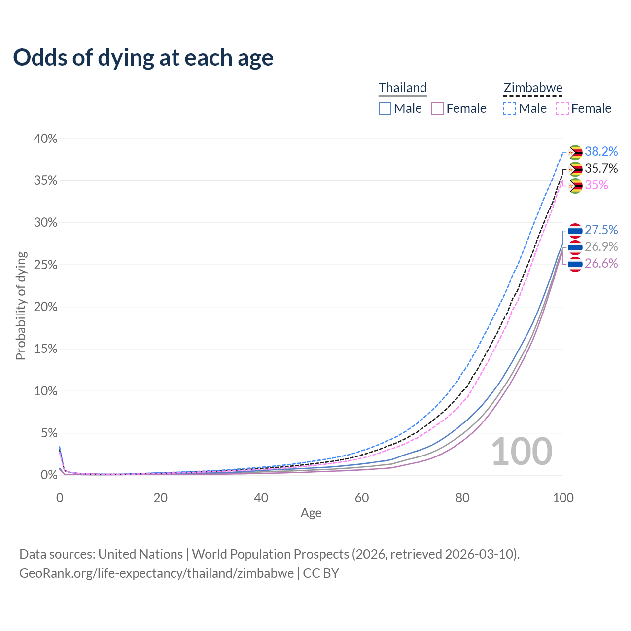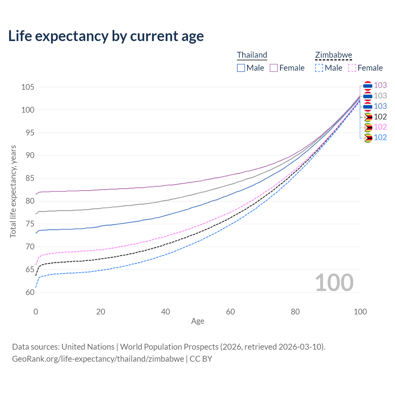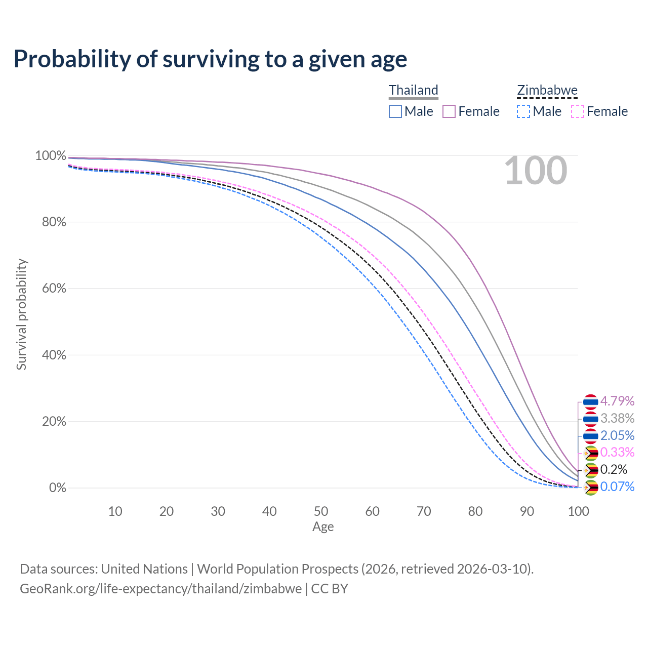 This life expectancy calculator shows the odds of living to 100, 95, 90, and below based on current age for both males and females in Thailand and Zimbabwe, along with mean and median age of death. The calculations are based on the 2026 life tables (actuarial tables) from the UN World Population Prospects.