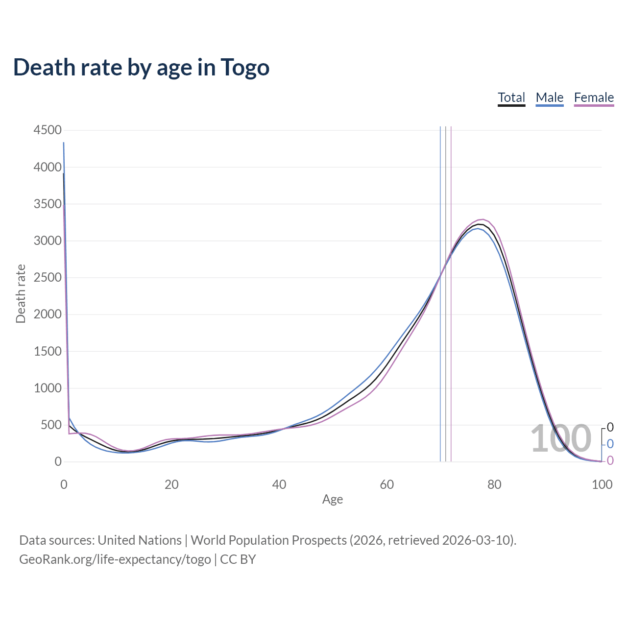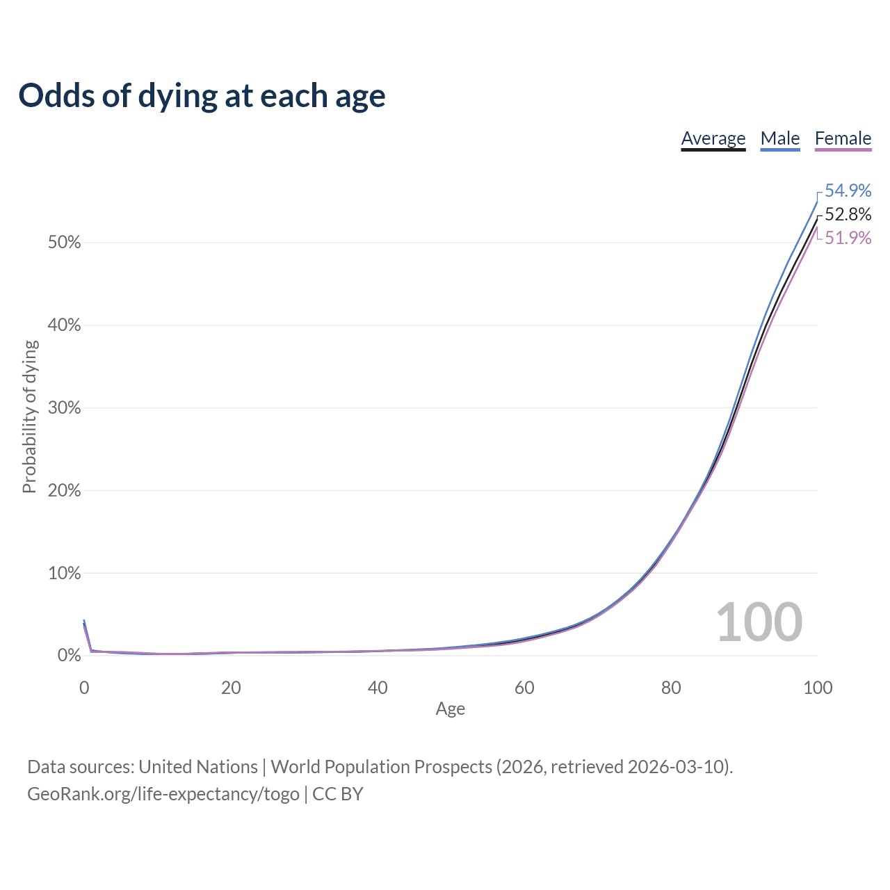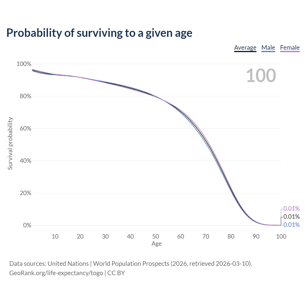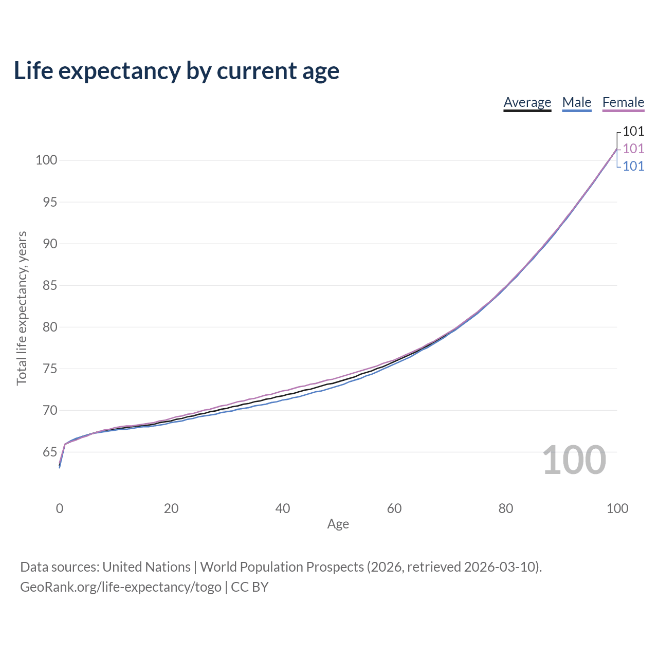 This life expectancy calculator shows the odds of living to 100, 95, 90, and below based on current age for both males and females in Togo, along with mean and median age of death. The calculations are based on the 2026 life tables (actuarial tables) from the UN World Population Prospects.