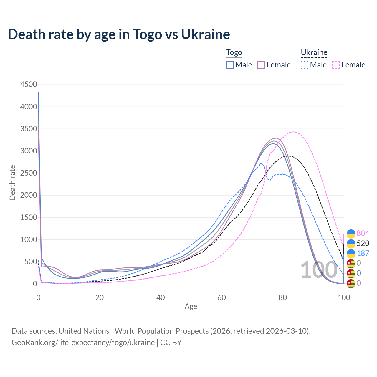 In Togo, the most common age of death is 0, compared to 82 in Ukraine. The median age of death is 71 in Togo and 78 in Ukraine, meaning only half of each cohort is expected to live past that age.