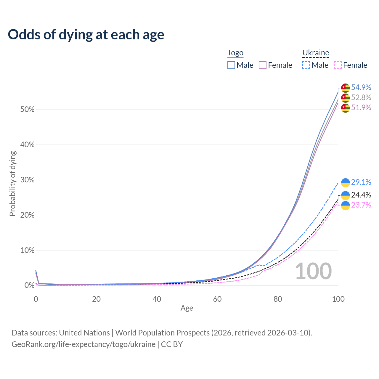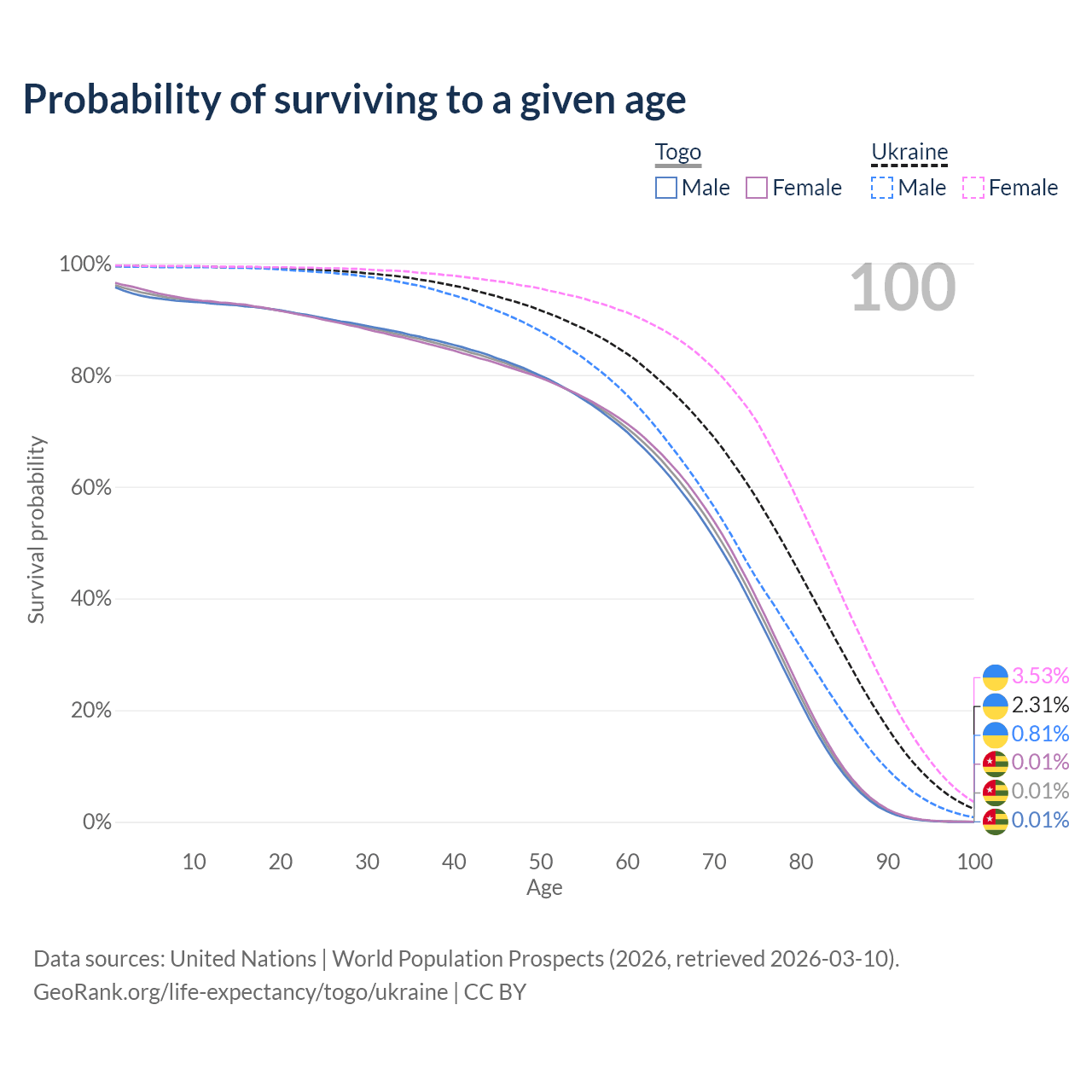 This life expectancy calculator shows the odds of living to 100, 95, 90, and below based on current age for both males and females in Togo and Ukraine, along with mean and median age of death. The calculations are based on the 2026 life tables (actuarial tables) from the UN World Population Prospects.