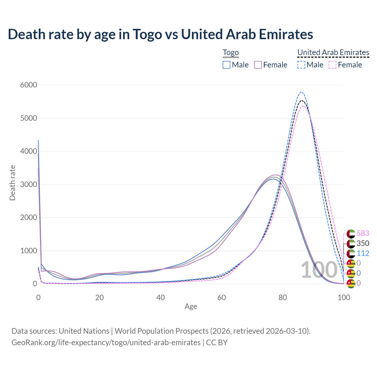 In Togo, the most common age of death is 0, compared to 86 in the United Arab Emirates. The median age of death is 71 in Togo and 85.6 in the United Arab Emirates, meaning only half of each cohort is expected to live past that age.