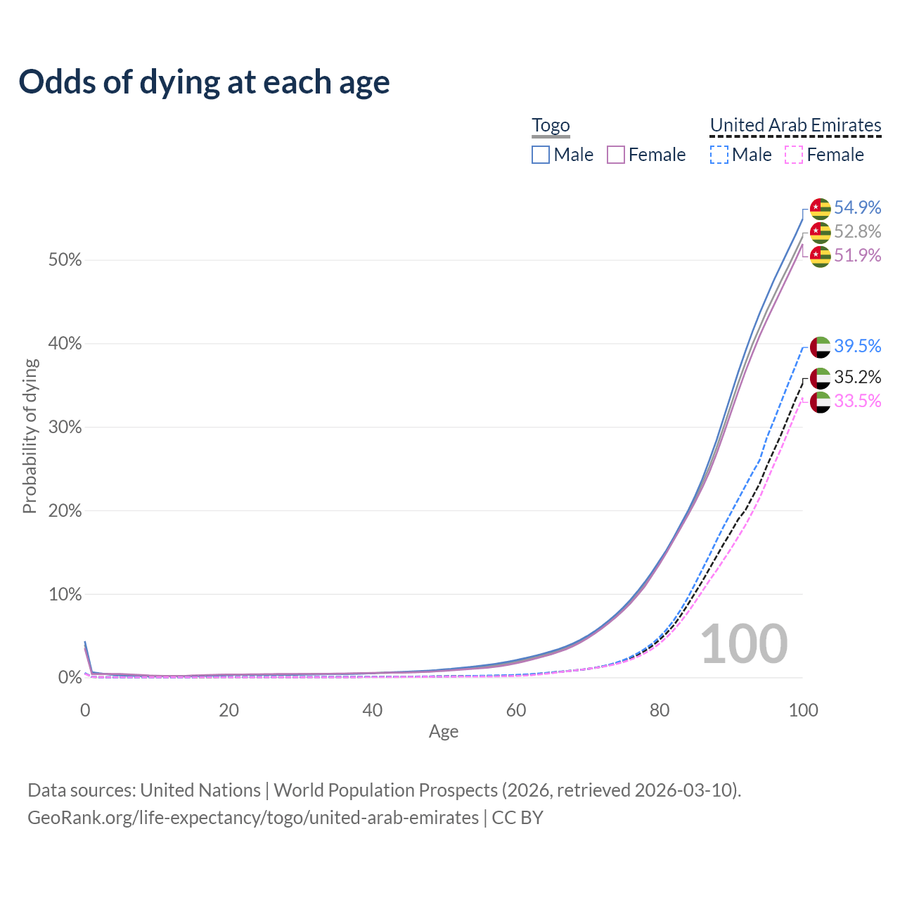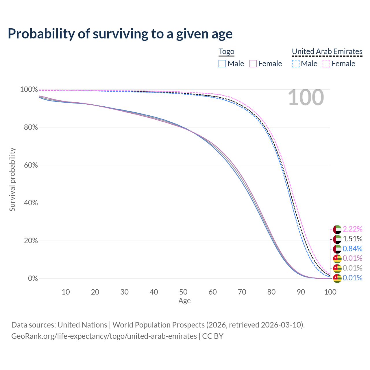 This life expectancy calculator shows the odds of living to 100, 95, 90, and below based on current age for both males and females in Togo and the United Arab Emirates, along with mean and median age of death. The calculations are based on the 2026 life tables (actuarial tables) from the UN World Population Prospects.
