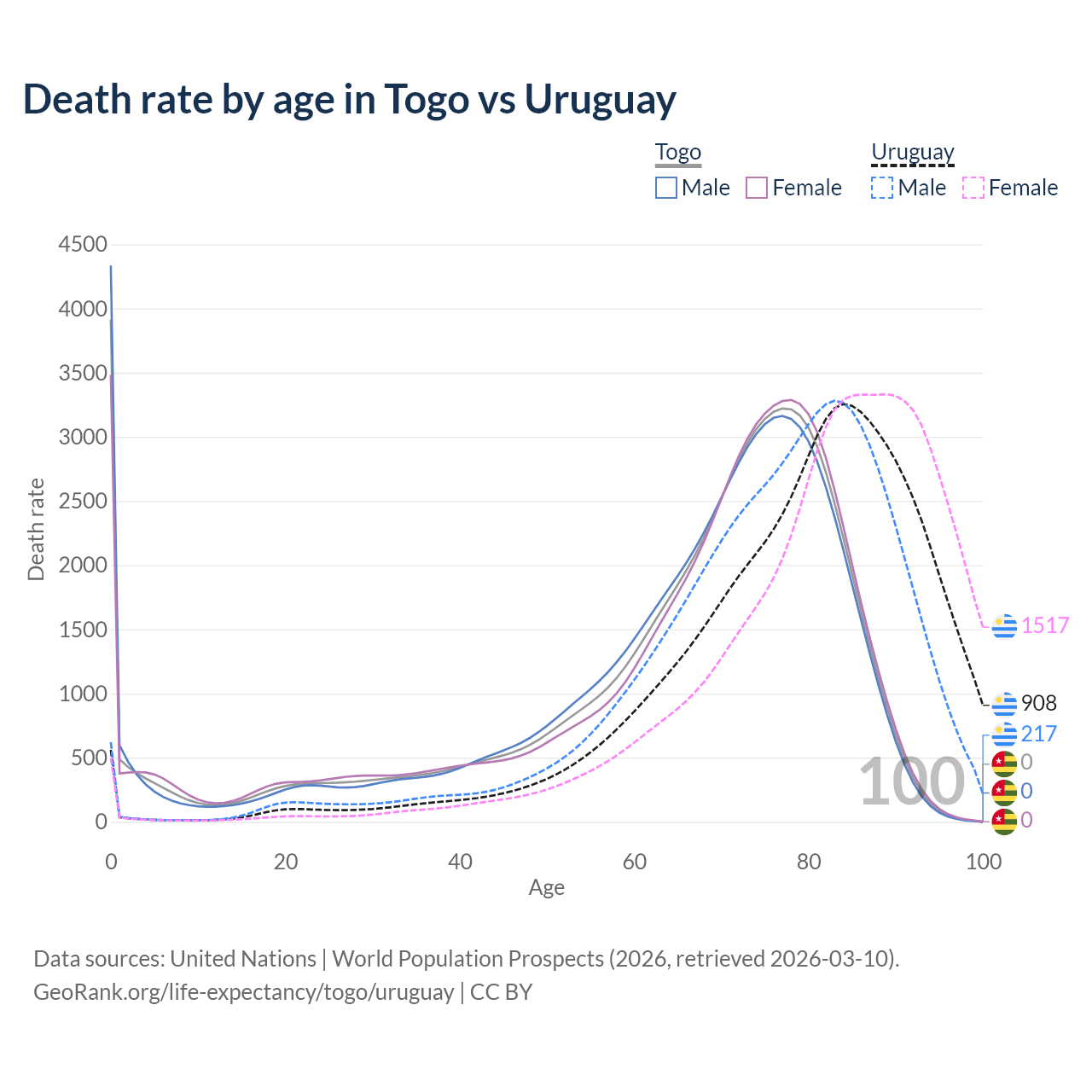 In Togo, the most common age of death is 0, compared to 84 in Uruguay. The median age of death is 71 in Togo and 81.8 in Uruguay, meaning only half of each cohort is expected to live past that age.