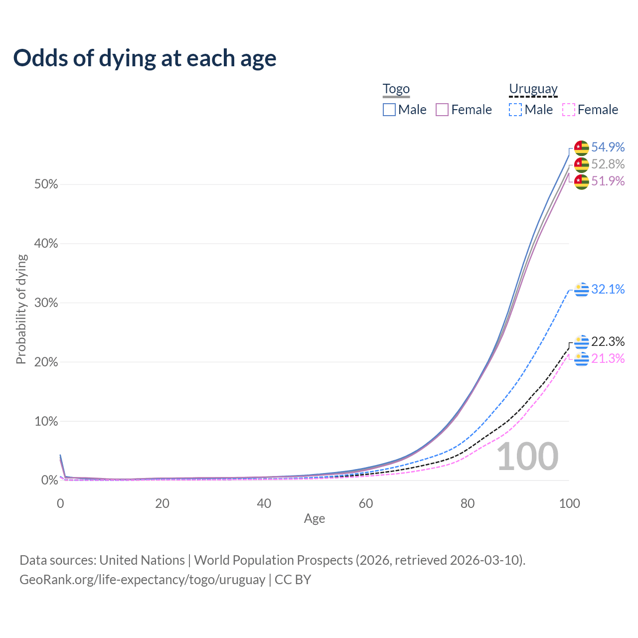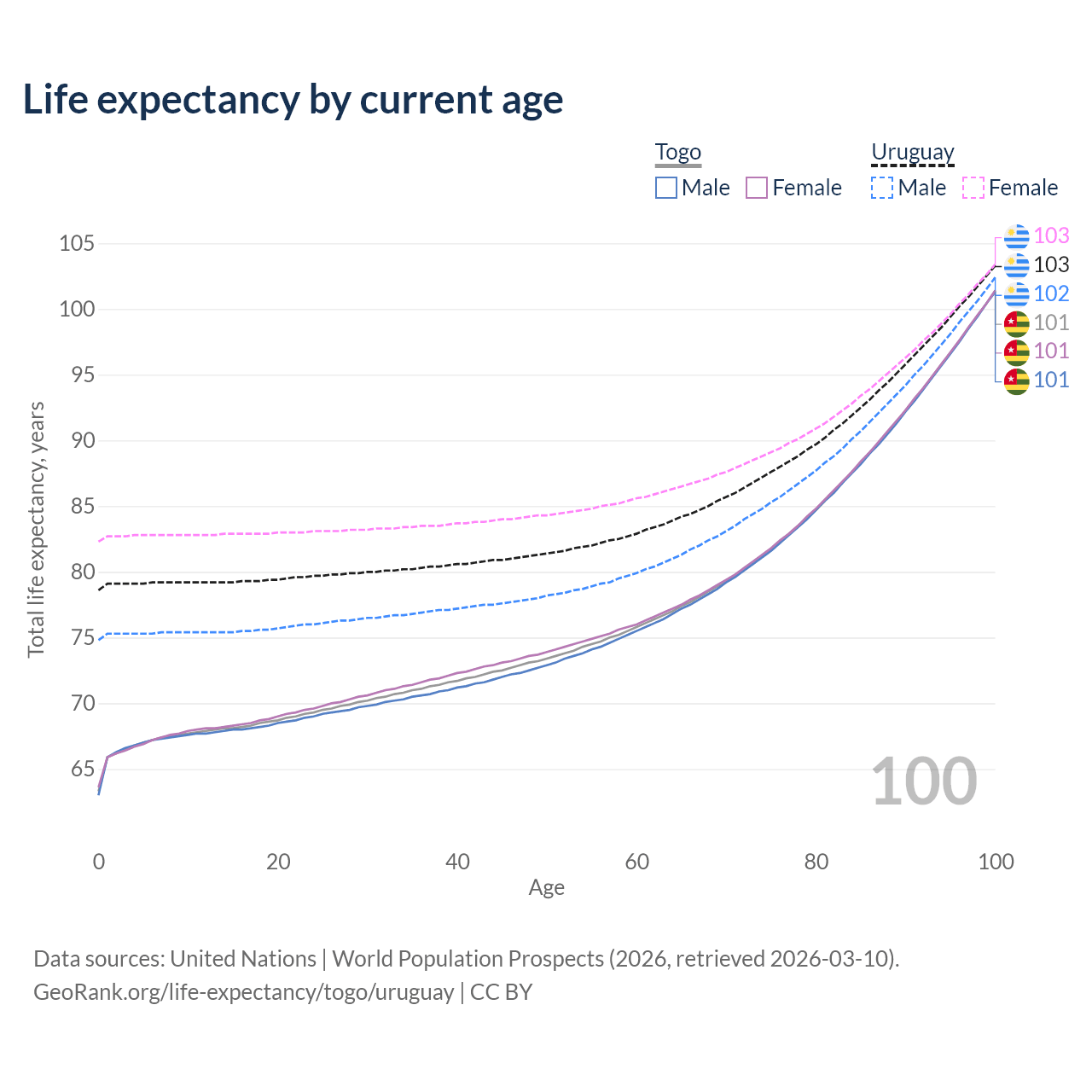 This life expectancy calculator shows the odds of living to 100, 95, 90, and below based on current age for both males and females in Togo and Uruguay, along with mean and median age of death. The calculations are based on the 2026 life tables (actuarial tables) from the UN World Population Prospects.