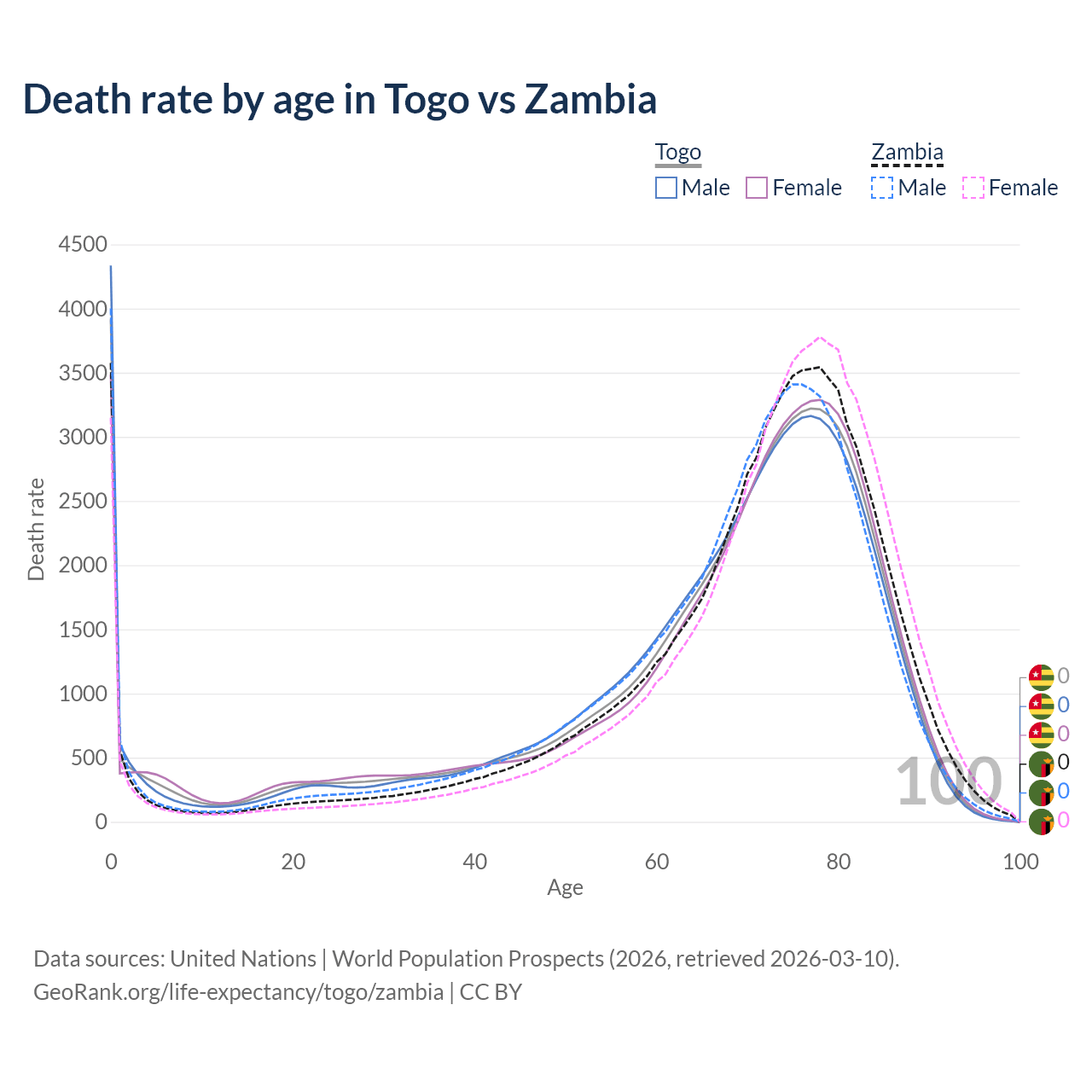 In Togo, the most common age of death is 0, compared to 0 in Zambia. The median age of death is 71 in Togo and 73.1 in Zambia, meaning only half of each cohort is expected to live past that age.