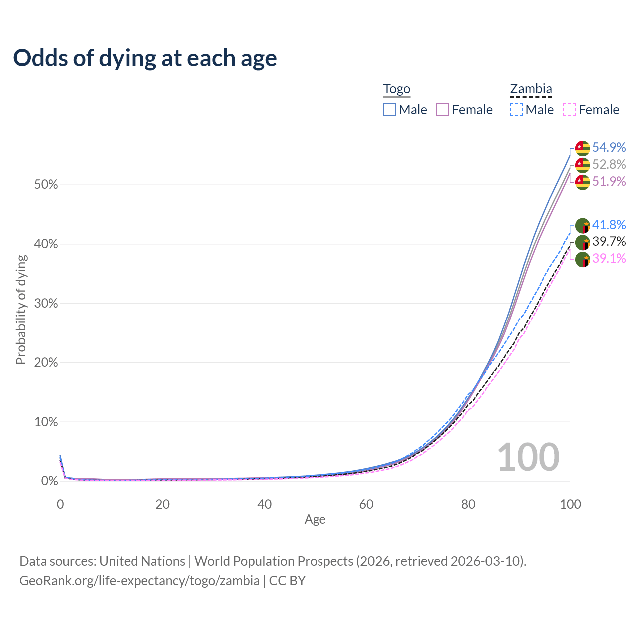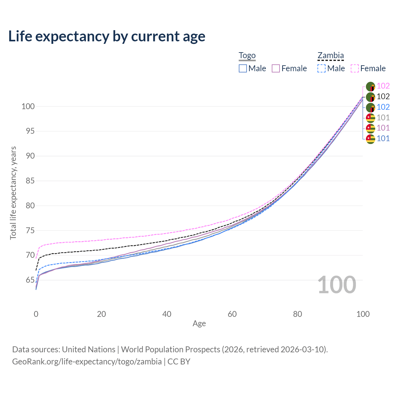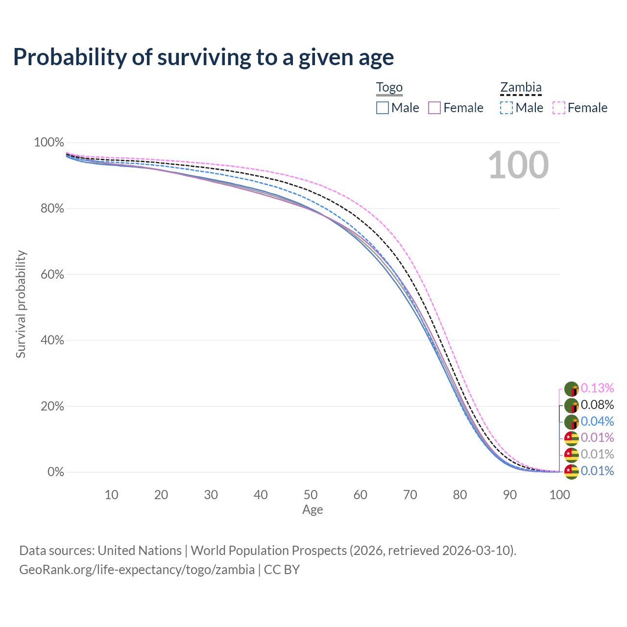 This life expectancy calculator shows the odds of living to 100, 95, 90, and below based on current age for both males and females in Togo and Zambia, along with mean and median age of death. The calculations are based on the 2026 life tables (actuarial tables) from the UN World Population Prospects.