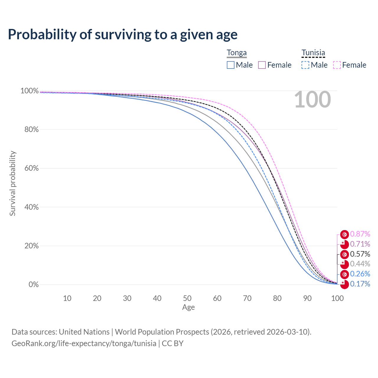 This life expectancy calculator shows the odds of living to 100, 95, 90, and below based on current age for both males and females in Tonga and Tunisia, along with mean and median age of death. The calculations are based on the 2026 life tables (actuarial tables) from the UN World Population Prospects.
