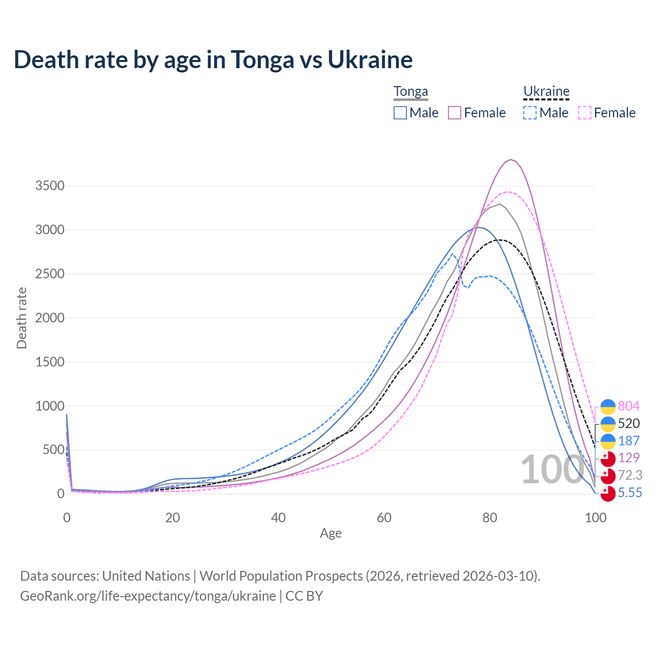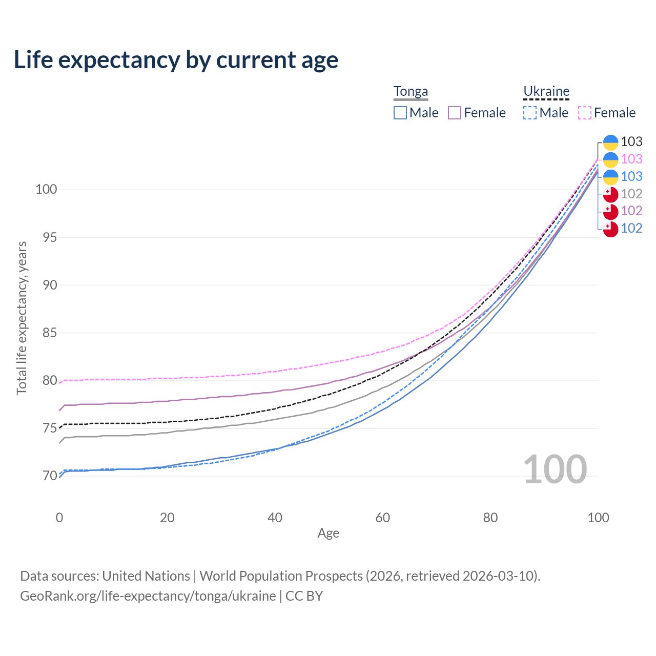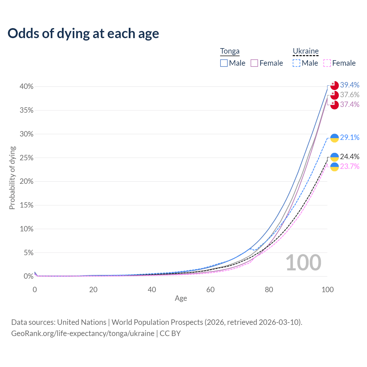 This life expectancy calculator shows the odds of living to 100, 95, 90, and below based on current age for both males and females in Tonga and Ukraine, along with mean and median age of death. The calculations are based on the 2026 life tables (actuarial tables) from the UN World Population Prospects.