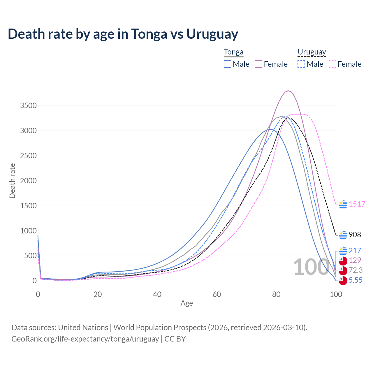 This life expectancy calculator shows the odds of living to 100, 95, 90, and below based on current age for both males and females in Tonga and Uruguay, along with mean and median age of death. The calculations are based on the 2026 life tables (actuarial tables) from the UN World Population Prospects.