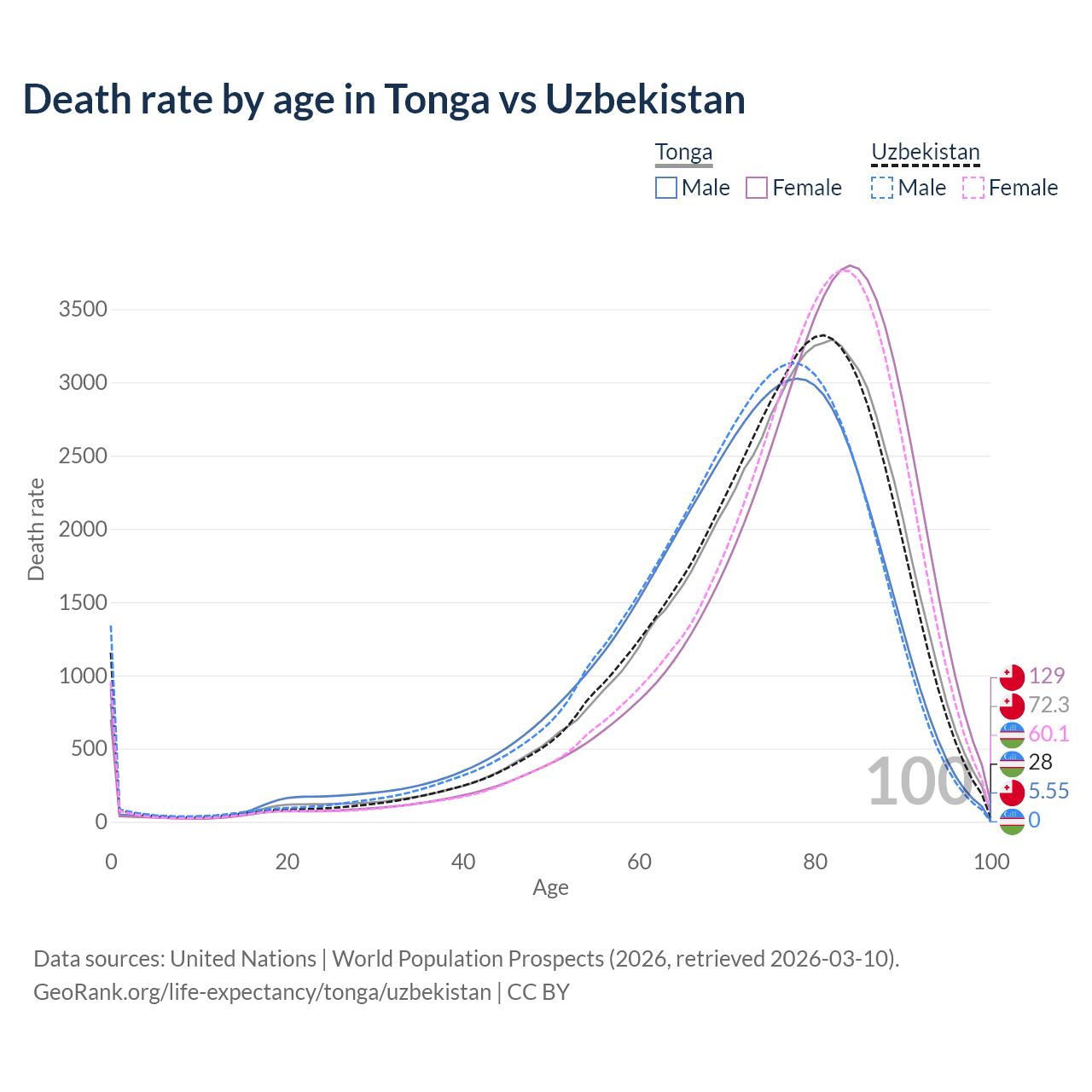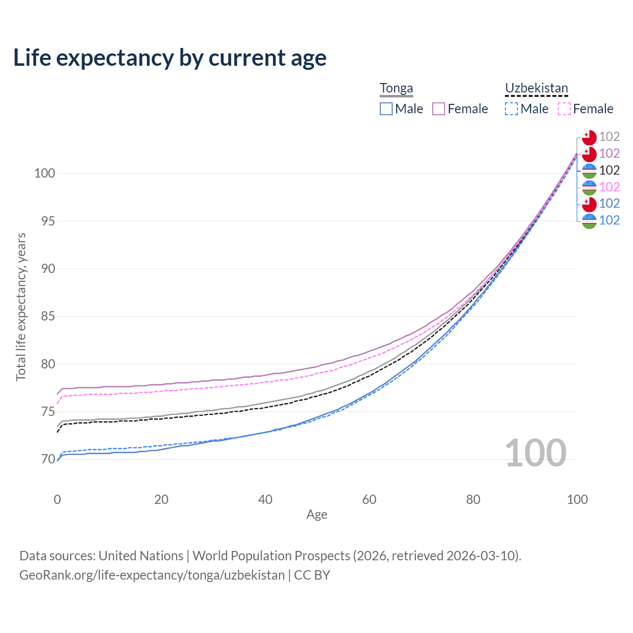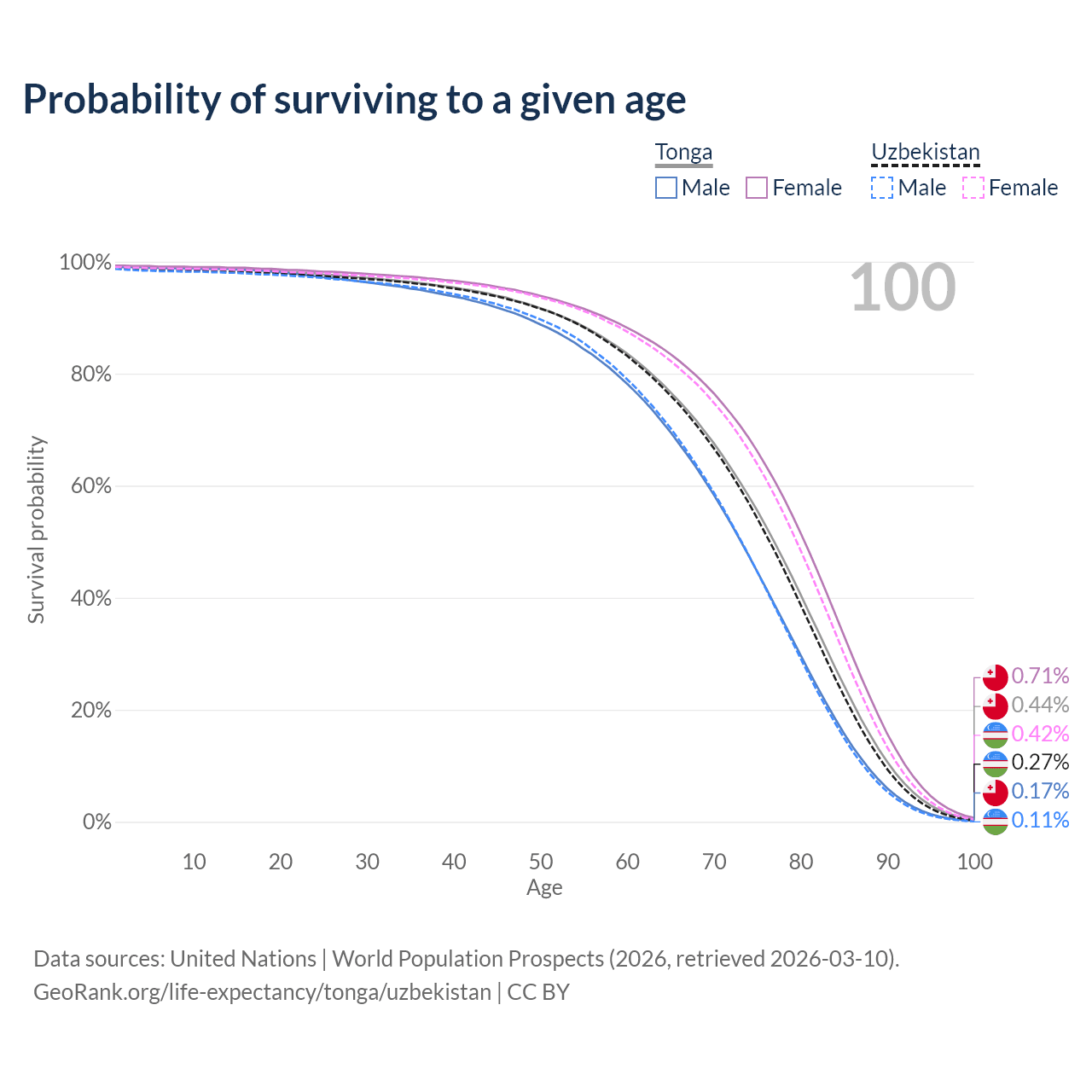 This life expectancy calculator shows the odds of living to 100, 95, 90, and below based on current age for both males and females in Tonga and Uzbekistan, along with mean and median age of death. The calculations are based on the 2026 life tables (actuarial tables) from the UN World Population Prospects.