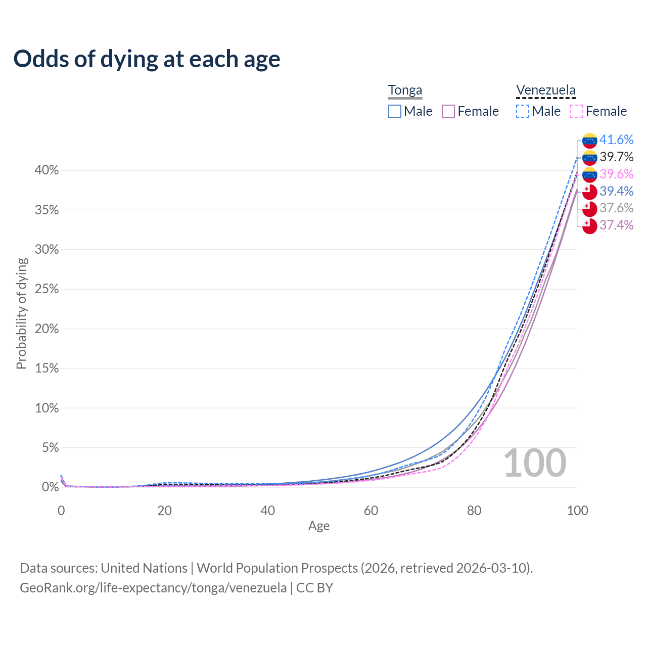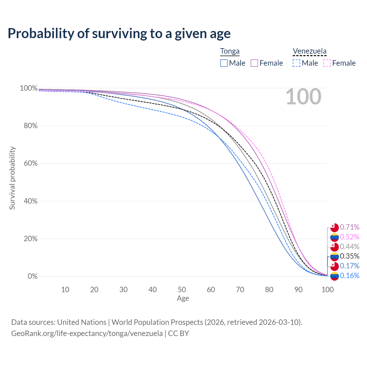 This life expectancy calculator shows the odds of living to 100, 95, 90, and below based on current age for both males and females in Tonga and Venezuela, along with mean and median age of death. The calculations are based on the 2026 life tables (actuarial tables) from the UN World Population Prospects.