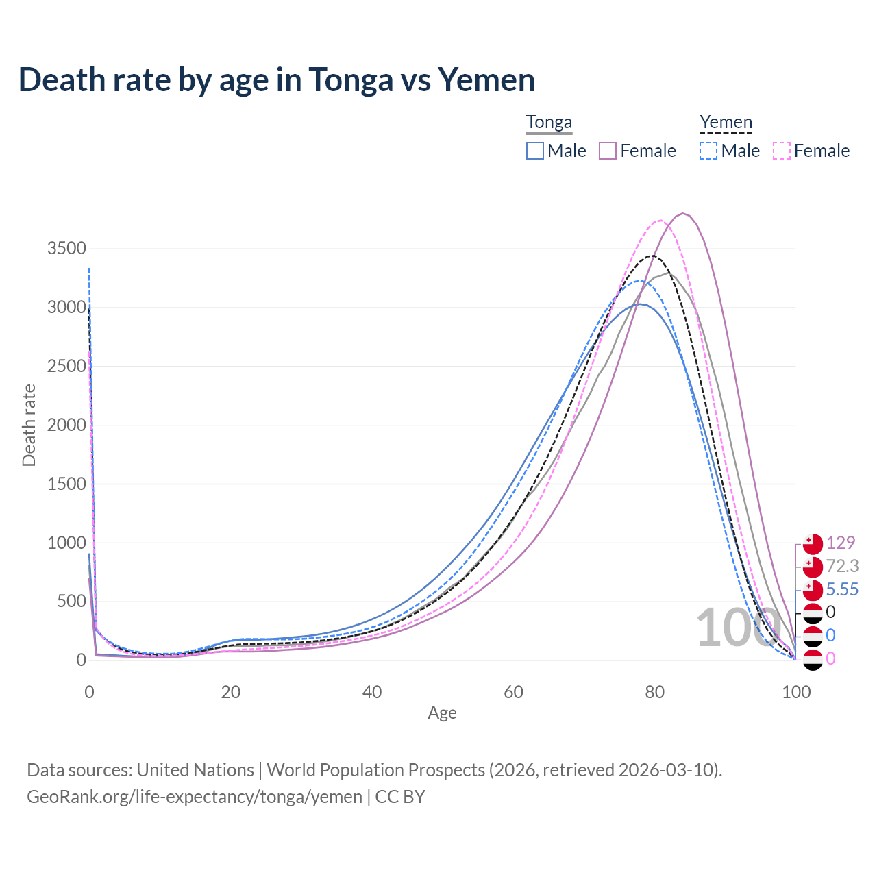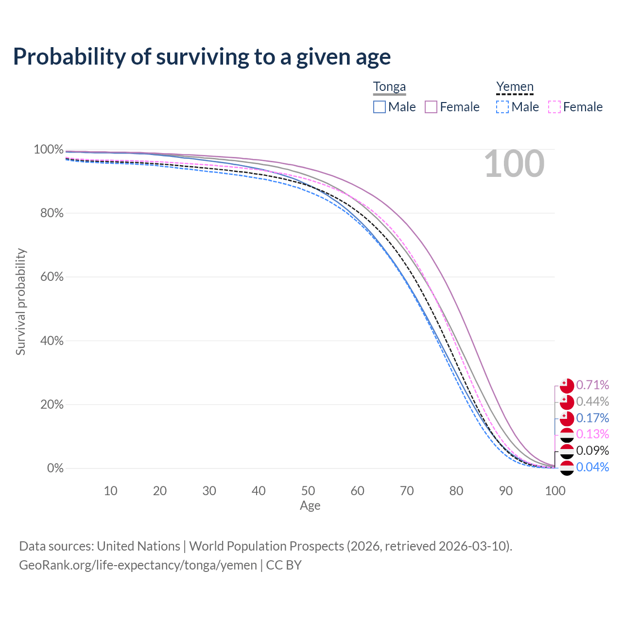 This life expectancy calculator shows the odds of living to 100, 95, 90, and below based on current age for both males and females in Tonga and Yemen, along with mean and median age of death. The calculations are based on the 2026 life tables (actuarial tables) from the UN World Population Prospects.