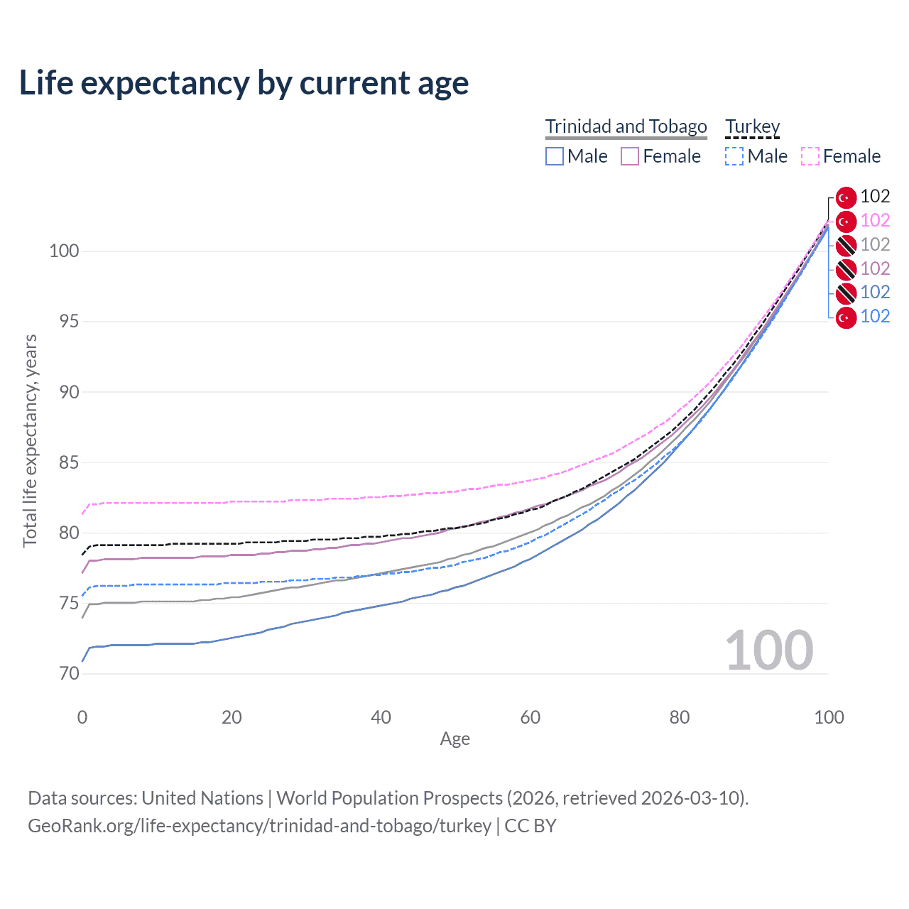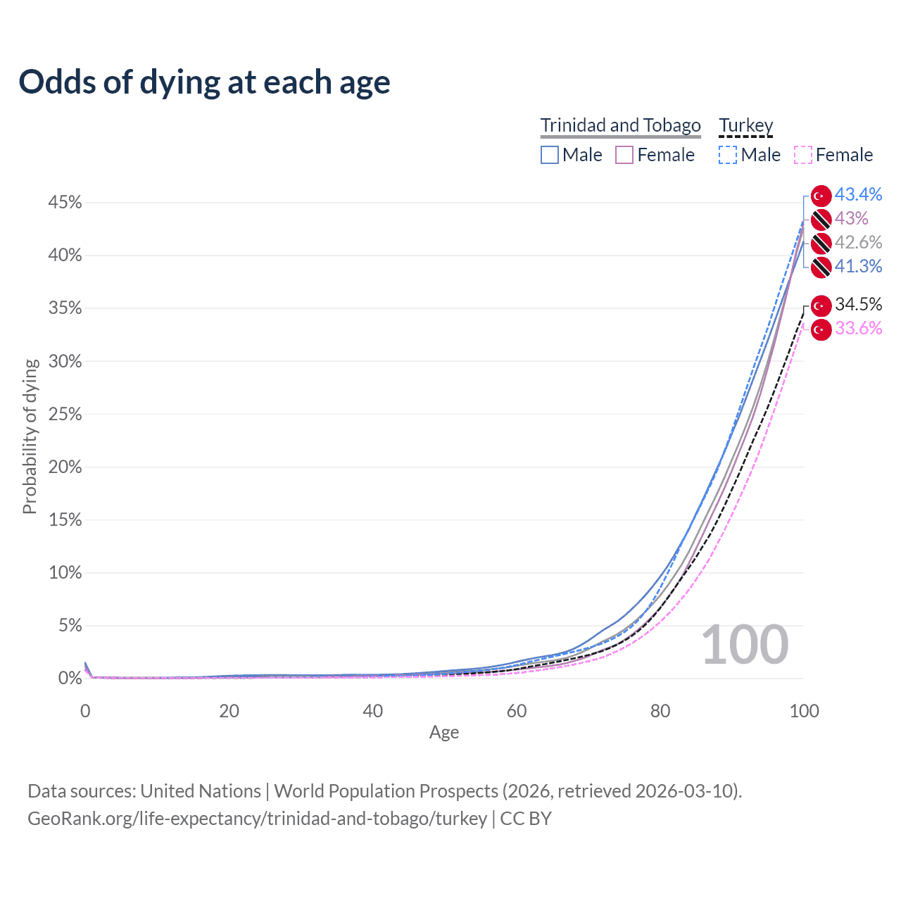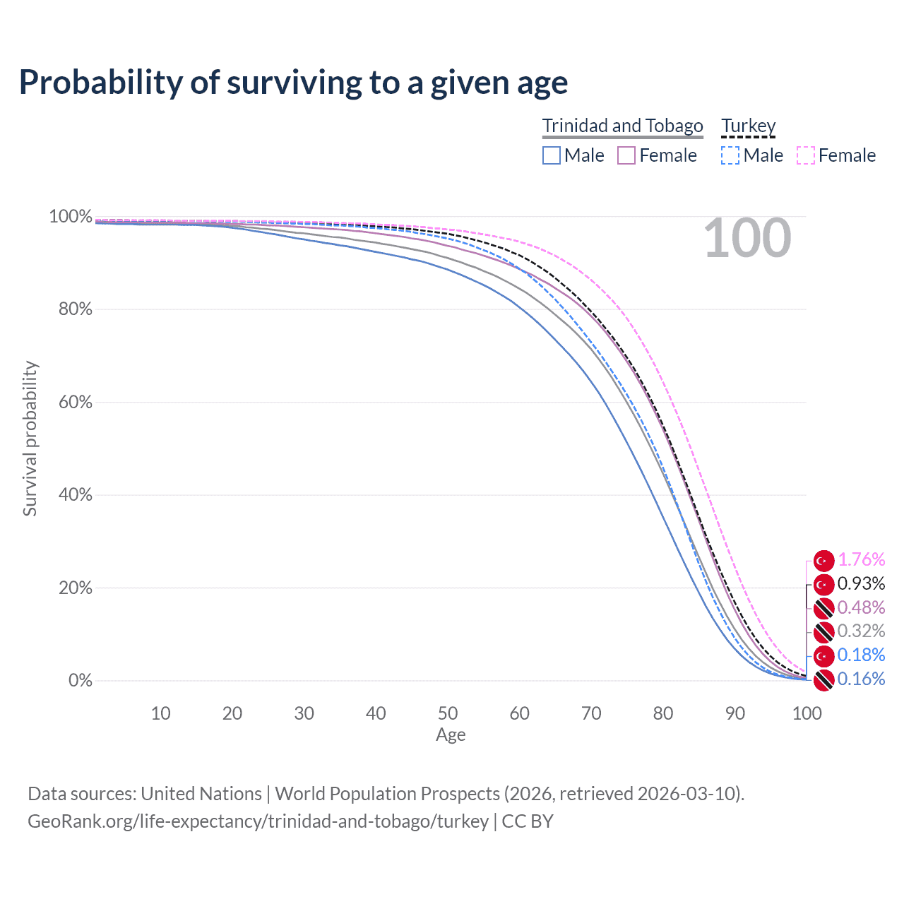 This life expectancy calculator shows the odds of living to 100, 95, 90, and below based on current age for both males and females in Trinidad and Tobago and Turkey, along with mean and median age of death. The calculations are based on the 2026 life tables (actuarial tables) from the UN World Population Prospects.