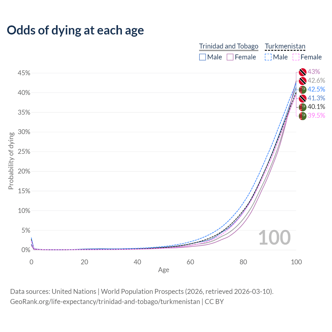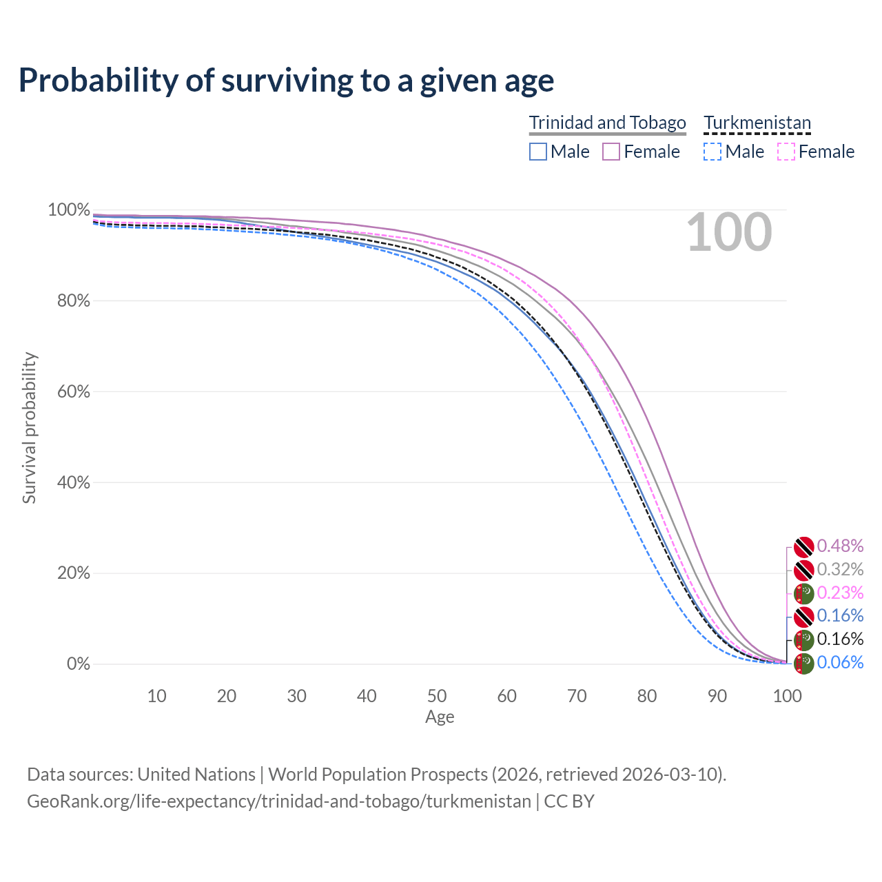 This life expectancy calculator shows the odds of living to 100, 95, 90, and below based on current age for both males and females in Trinidad and Tobago and Turkmenistan, along with mean and median age of death. The calculations are based on the 2026 life tables (actuarial tables) from the UN World Population Prospects.