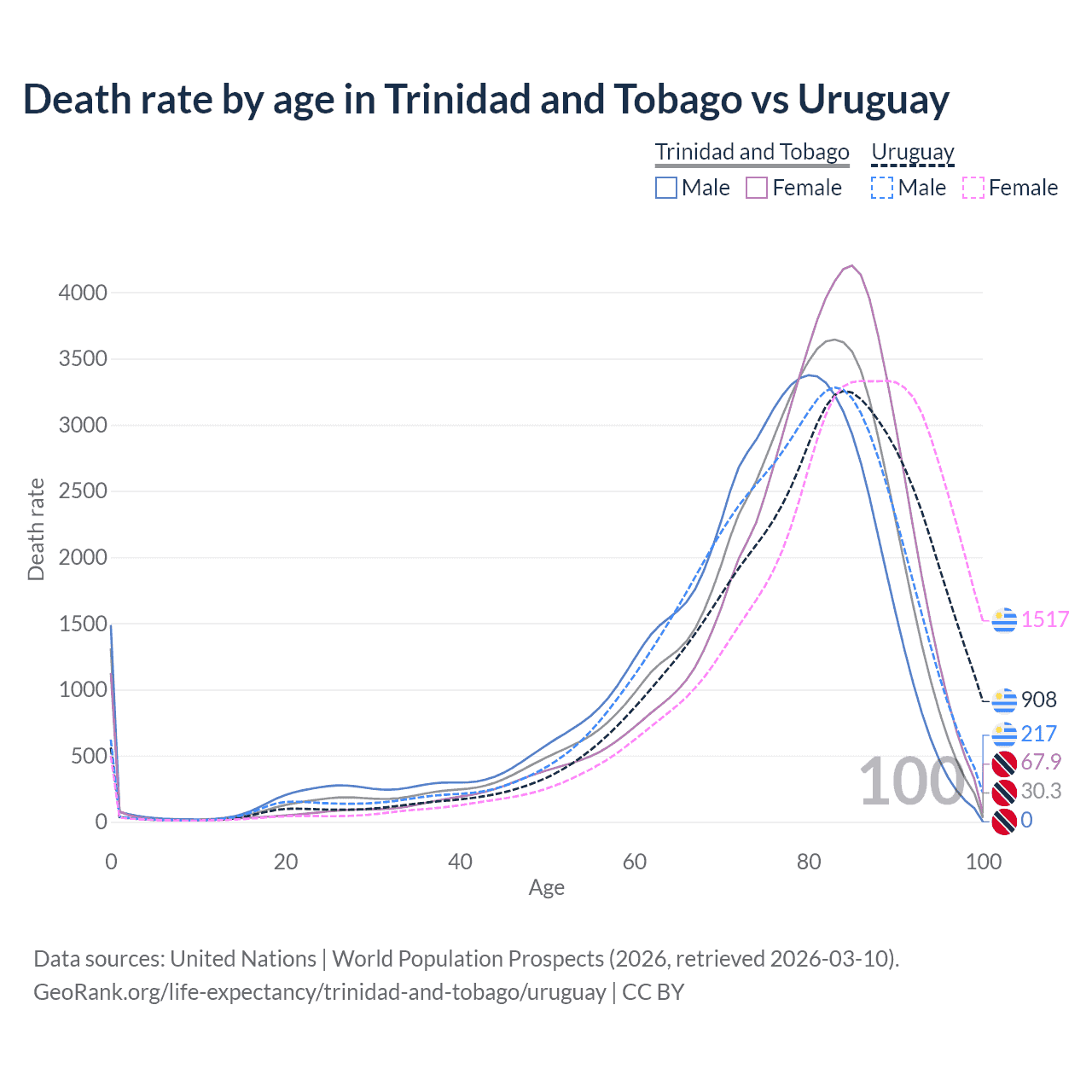 In Trinidad and Tobago, the most common age of death is 83, compared to 84 in Uruguay. The median age of death is 78.4 in Trinidad and Tobago and 81.8 in Uruguay, meaning only half of each cohort is expected to live past that age.