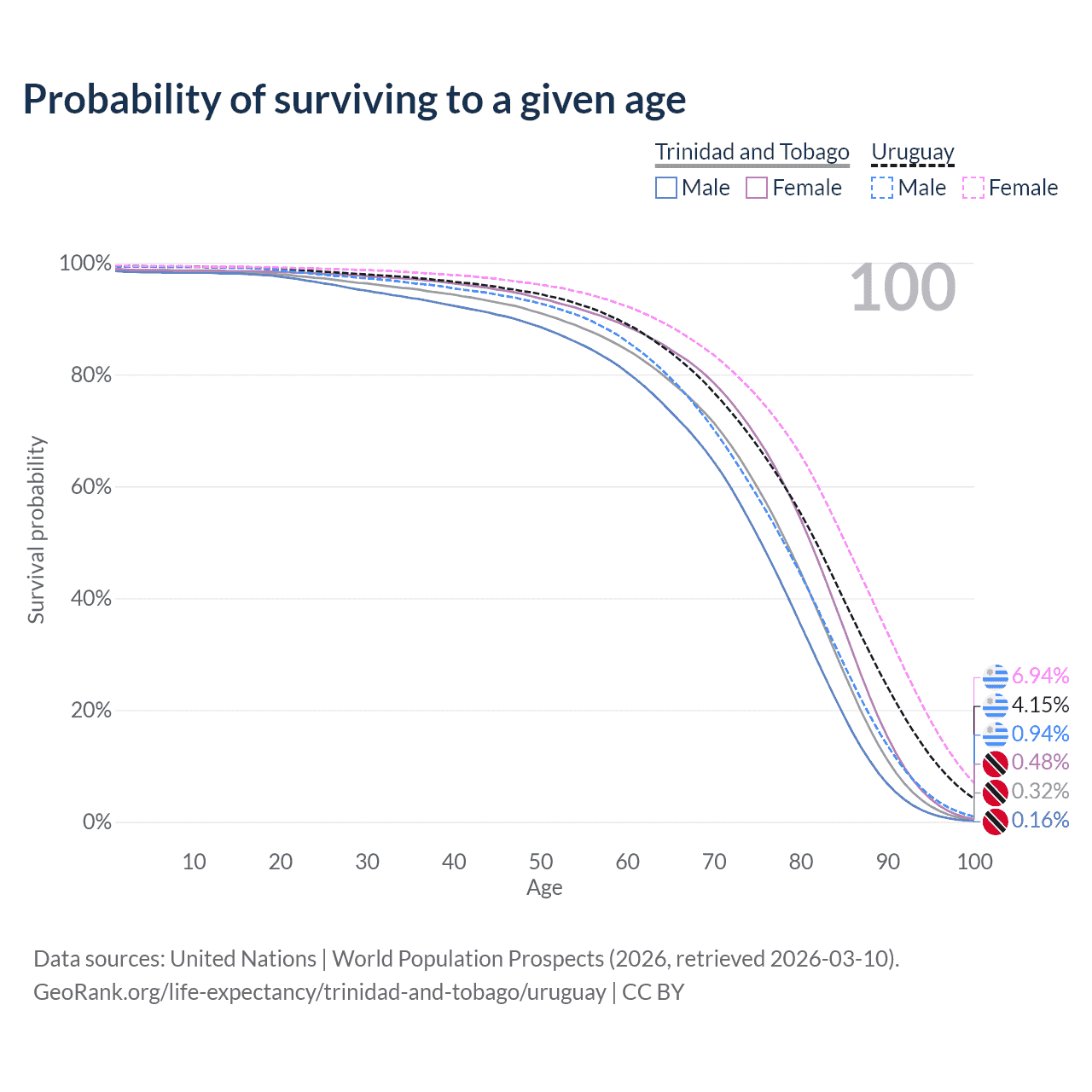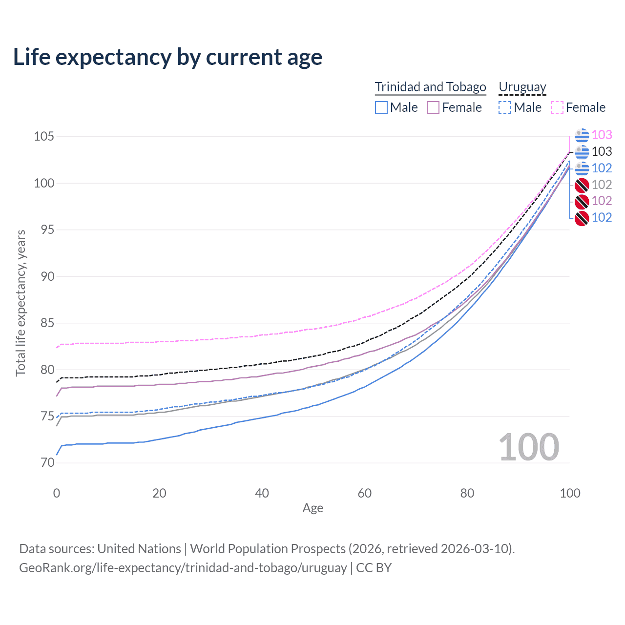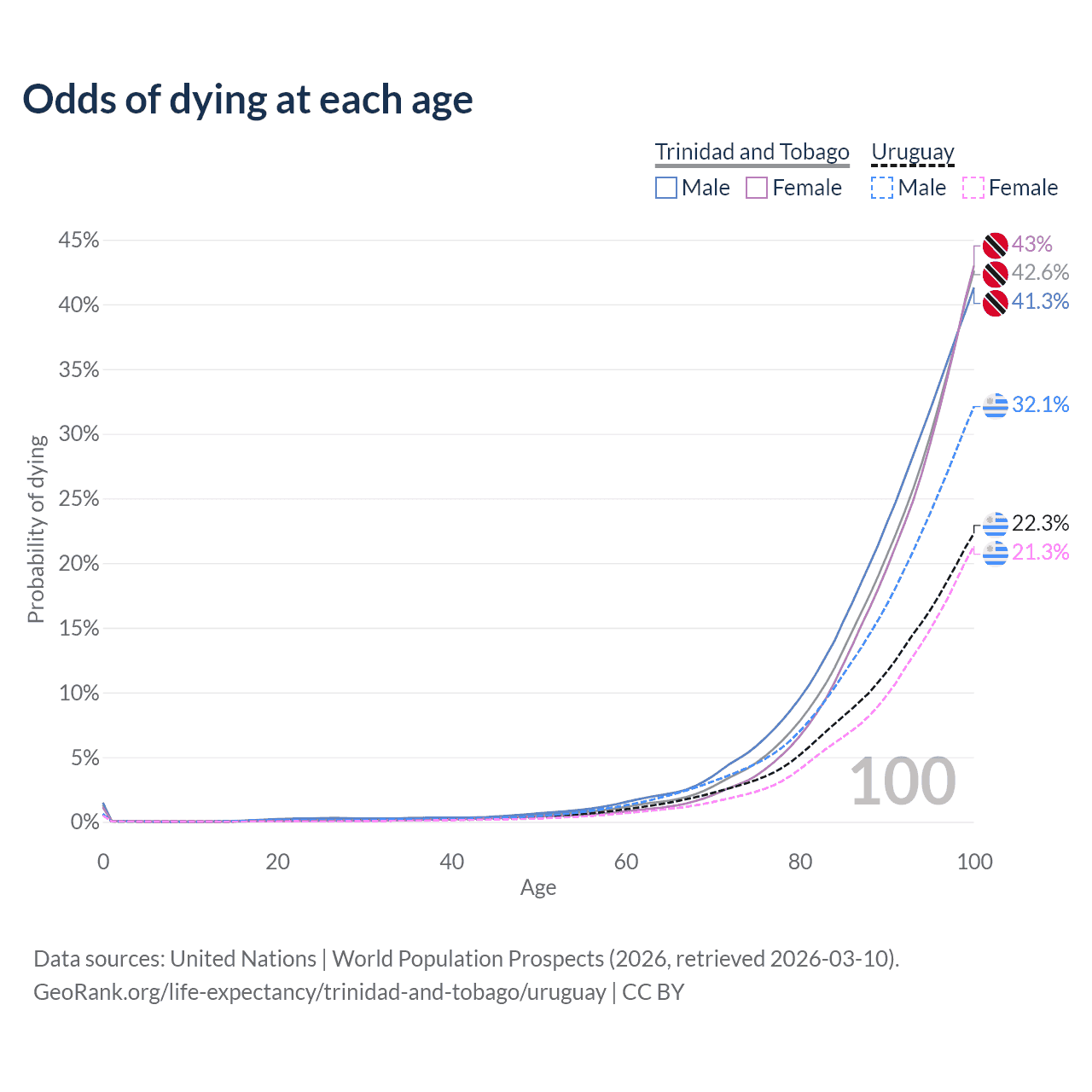 This life expectancy calculator shows the odds of living to 100, 95, 90, and below based on current age for both males and females in Trinidad and Tobago and Uruguay, along with mean and median age of death. The calculations are based on the 2026 life tables (actuarial tables) from the UN World Population Prospects.