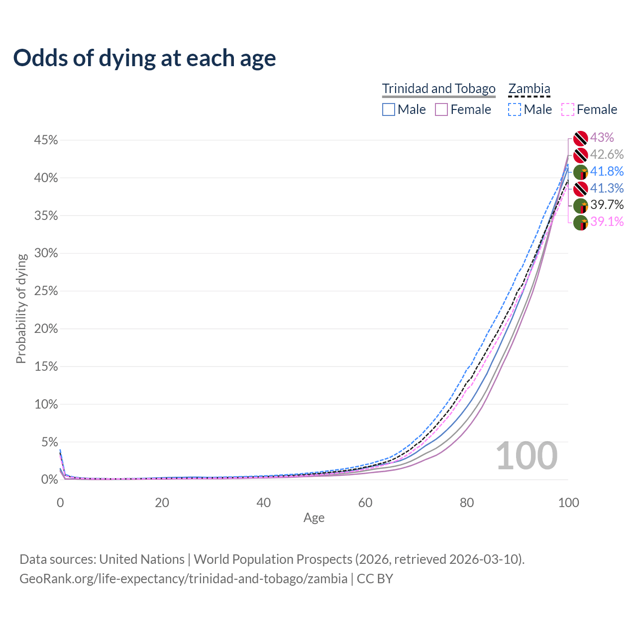 This life expectancy calculator shows the odds of living to 100, 95, 90, and below based on current age for both males and females in Trinidad and Tobago and Zambia, along with mean and median age of death. The calculations are based on the 2026 life tables (actuarial tables) from the UN World Population Prospects.