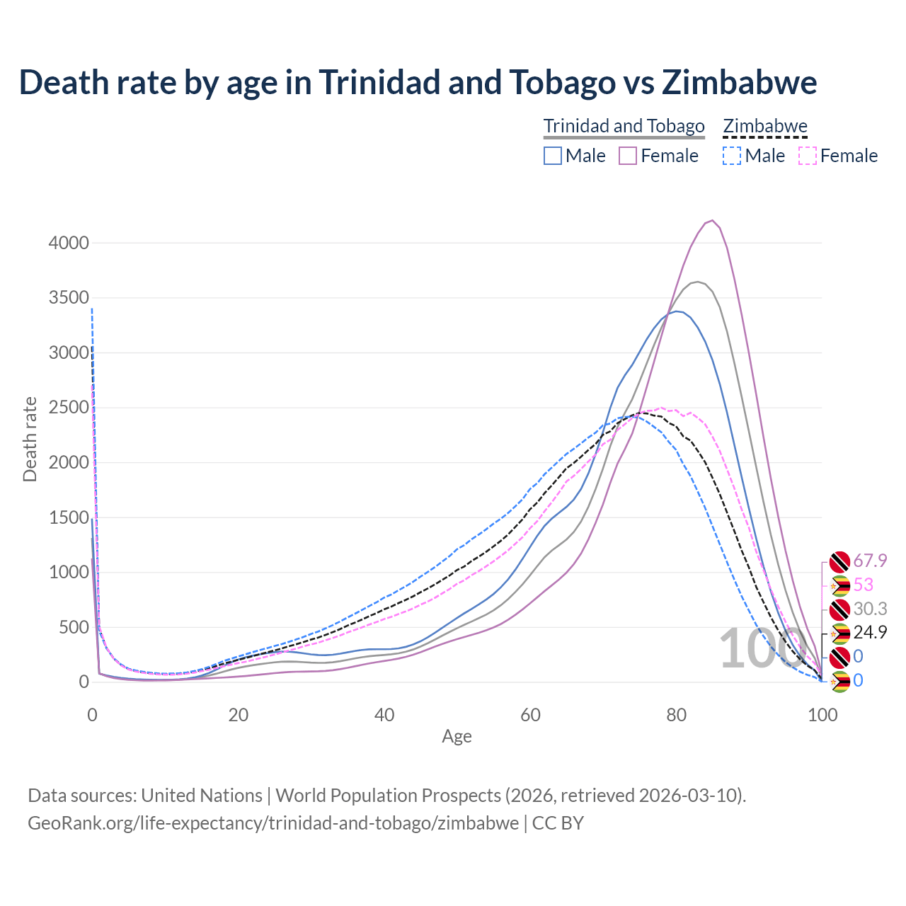 In Trinidad and Tobago, the most common age of death is 83, compared to 0 in Zimbabwe. The median age of death is 78.4 in Trinidad and Tobago and 68.8 in Zimbabwe, meaning only half of each cohort is expected to live past that age.
