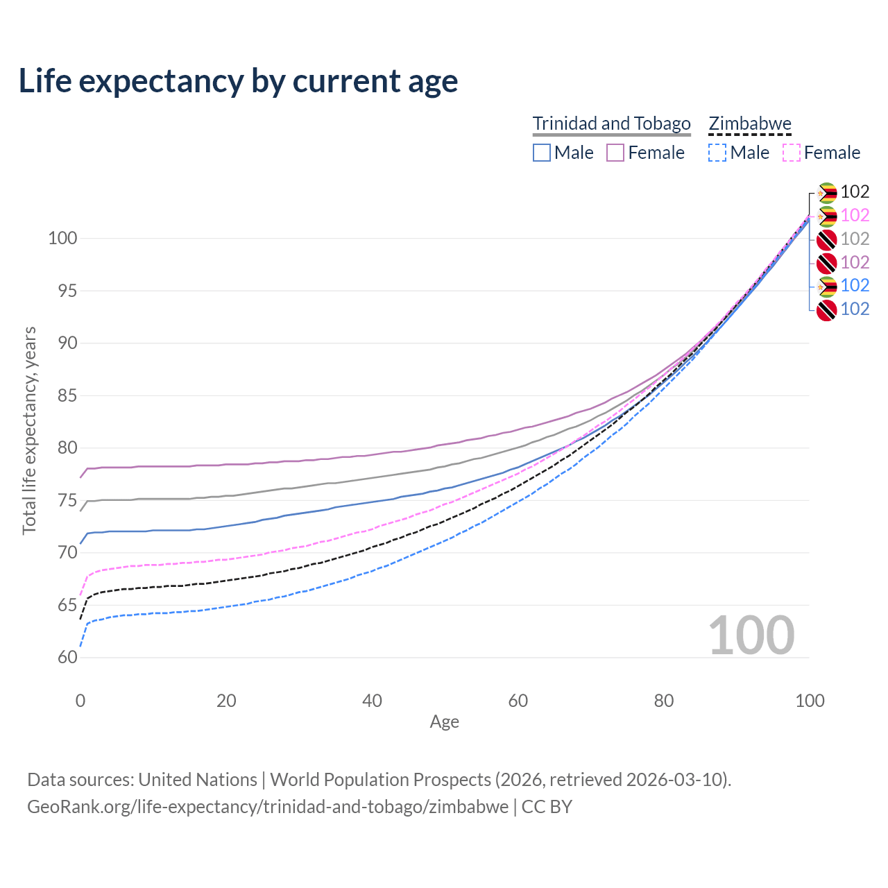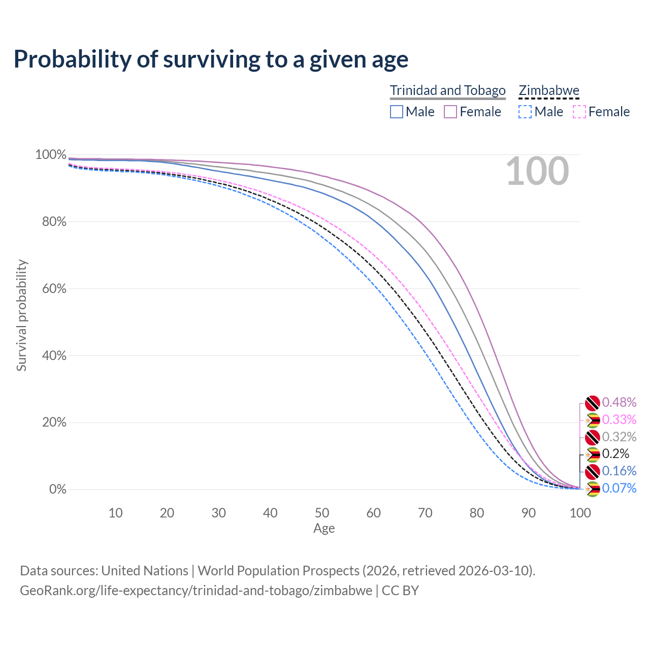 This life expectancy calculator shows the odds of living to 100, 95, 90, and below based on current age for both males and females in Trinidad and Tobago and Zimbabwe, along with mean and median age of death. The calculations are based on the 2026 life tables (actuarial tables) from the UN World Population Prospects.