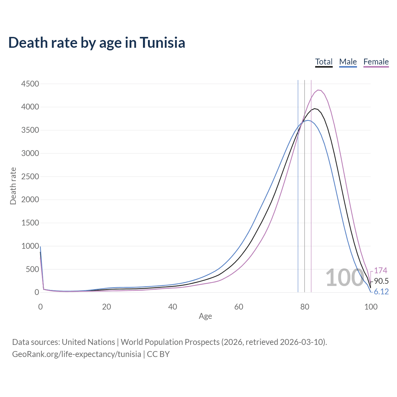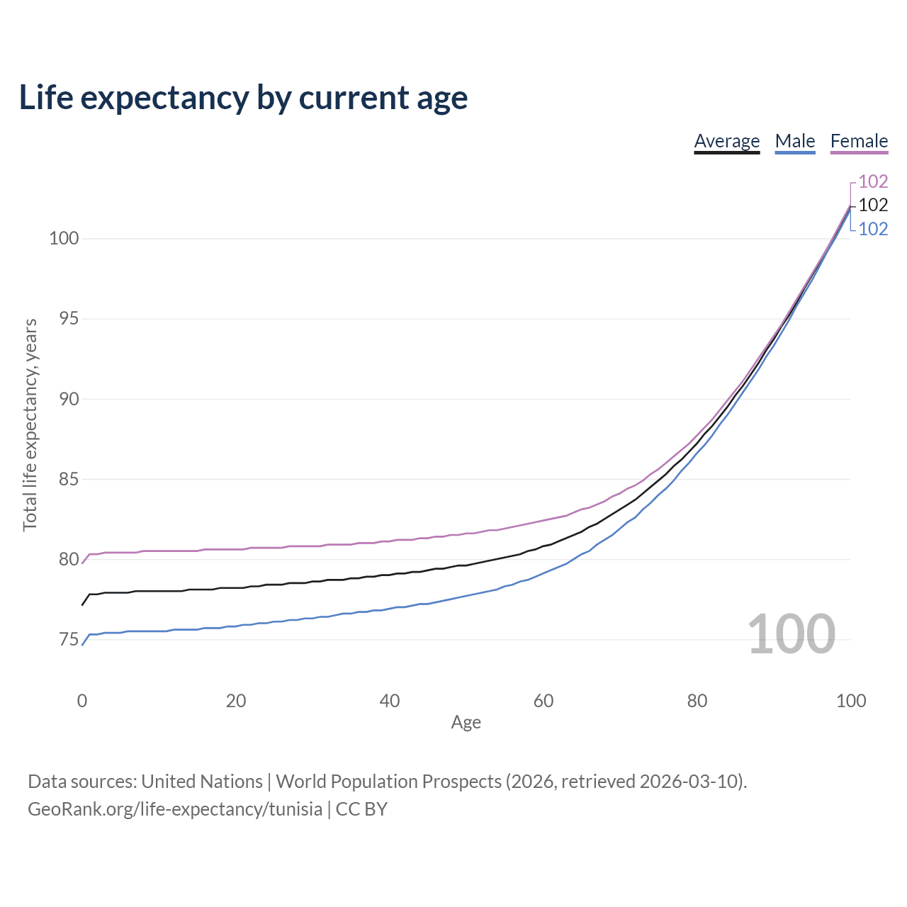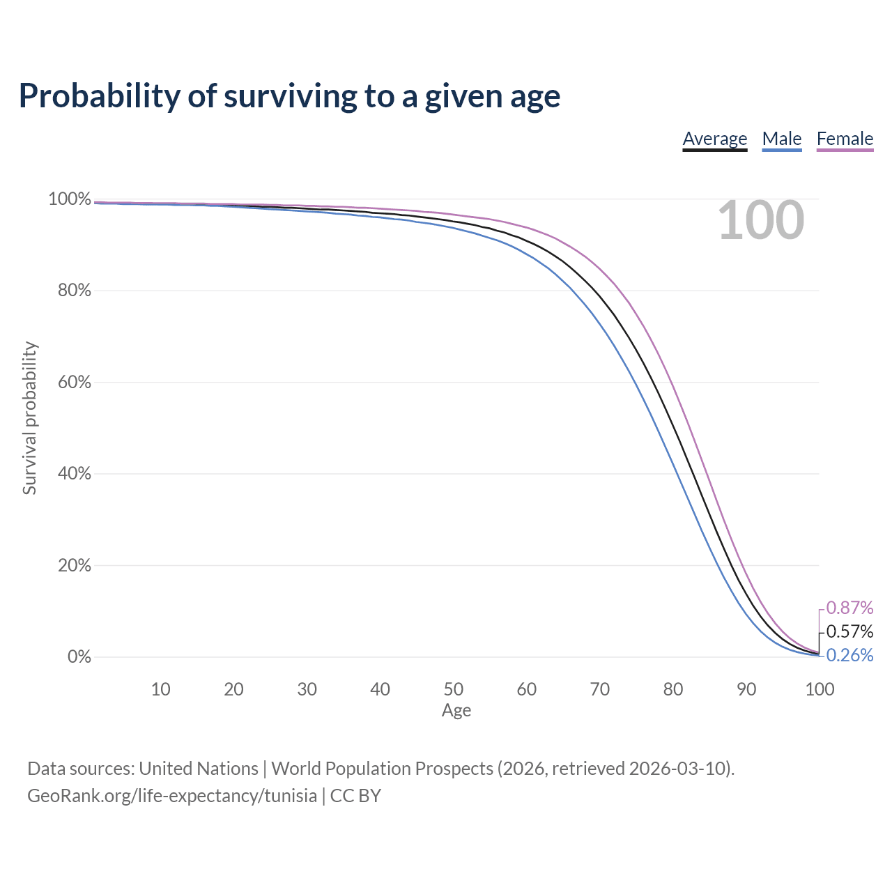 This life expectancy calculator shows the odds of living to 100, 95, 90, and below based on current age for both males and females in Tunisia, along with mean and median age of death. The calculations are based on the 2026 life tables (actuarial tables) from the UN World Population Prospects.