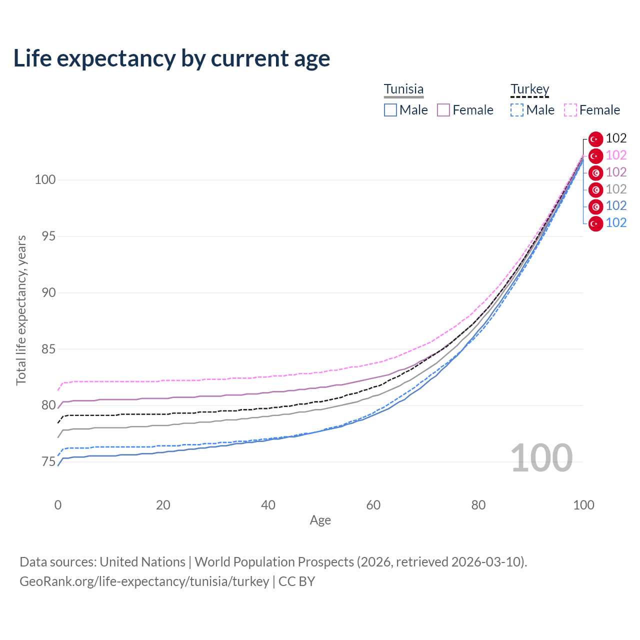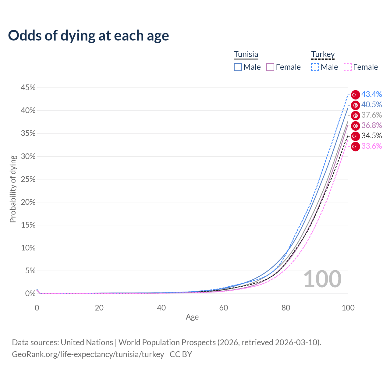 This life expectancy calculator shows the odds of living to 100, 95, 90, and below based on current age for both males and females in Tunisia and Turkey, along with mean and median age of death. The calculations are based on the 2026 life tables (actuarial tables) from the UN World Population Prospects.