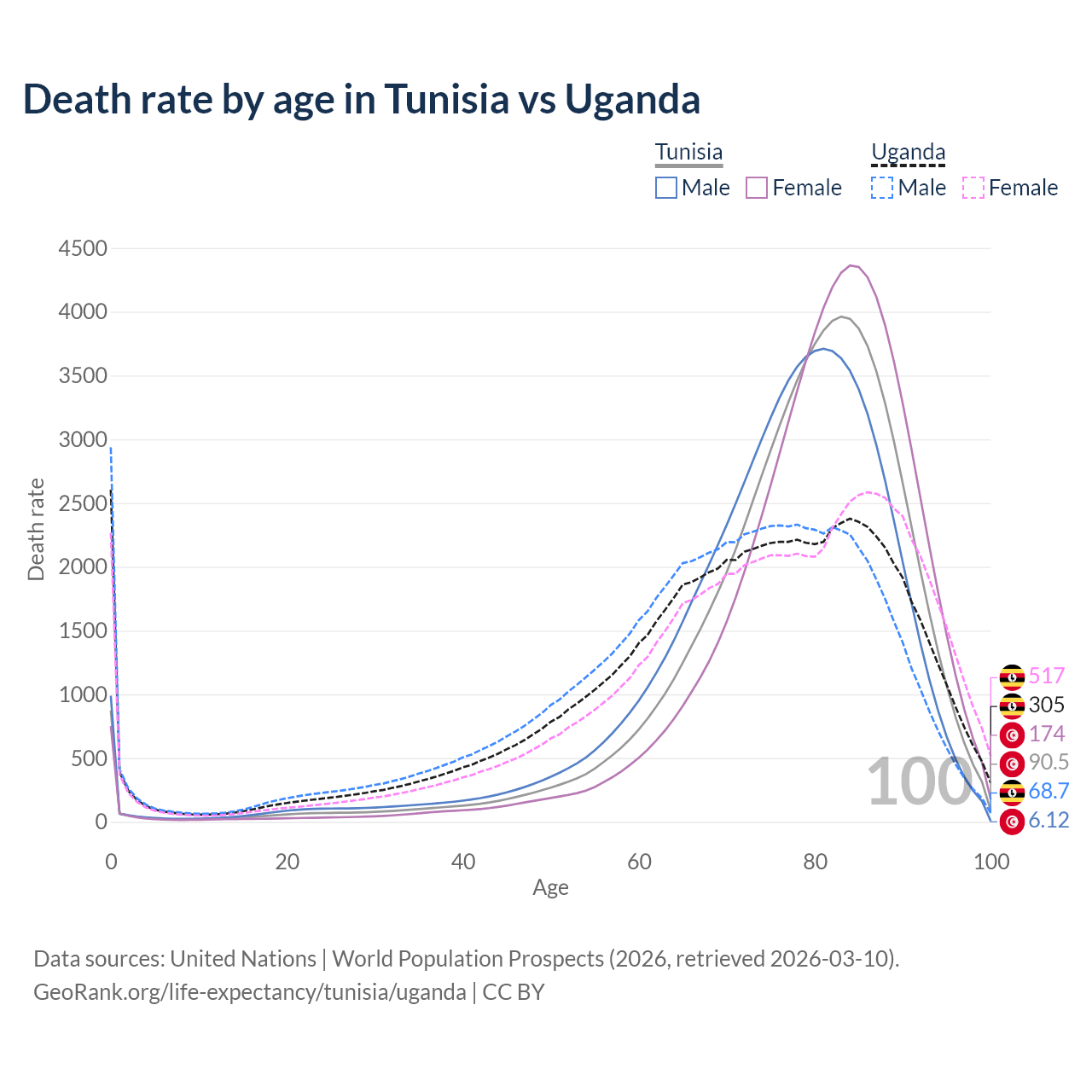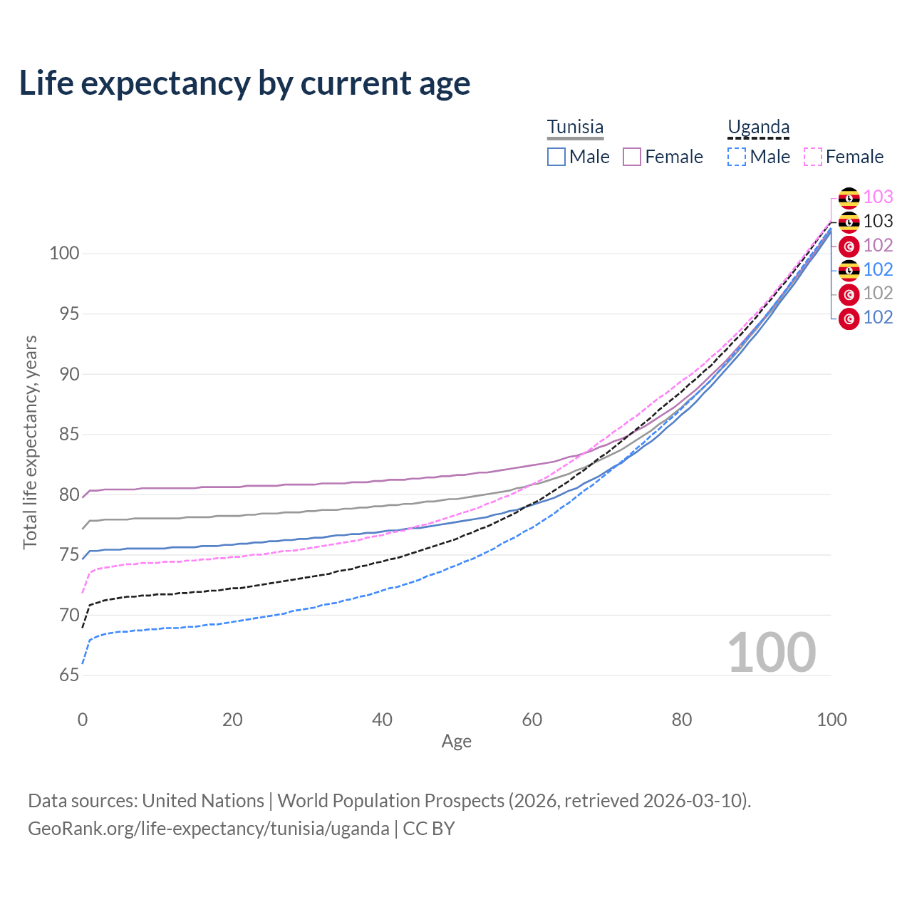 This life expectancy calculator shows the odds of living to 100, 95, 90, and below based on current age for both males and females in Tunisia and Uganda, along with mean and median age of death. The calculations are based on the 2026 life tables (actuarial tables) from the UN World Population Prospects.