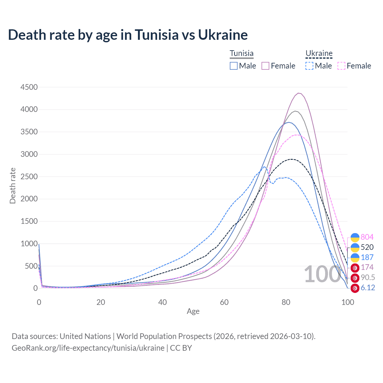 In Tunisia, the most common age of death is 83, compared to 82 in Ukraine. The median age of death is 80.2 in Tunisia and 78 in Ukraine, meaning only half of each cohort is expected to live past that age.