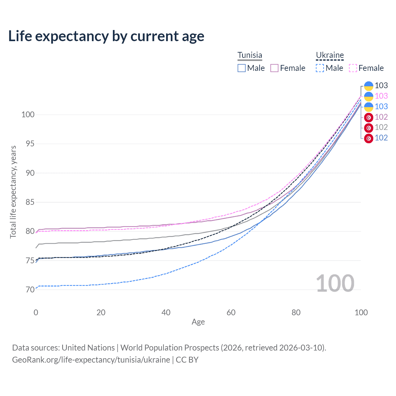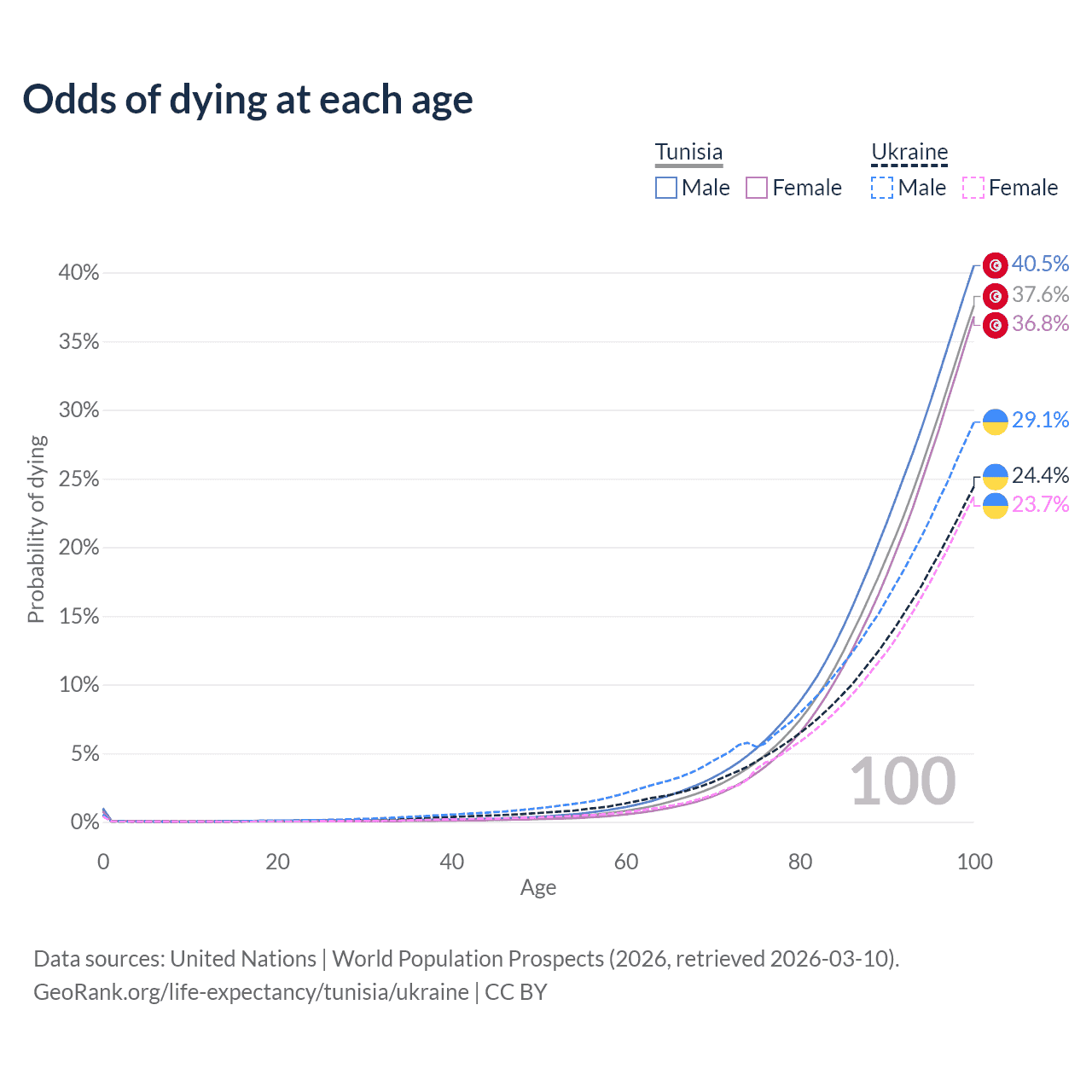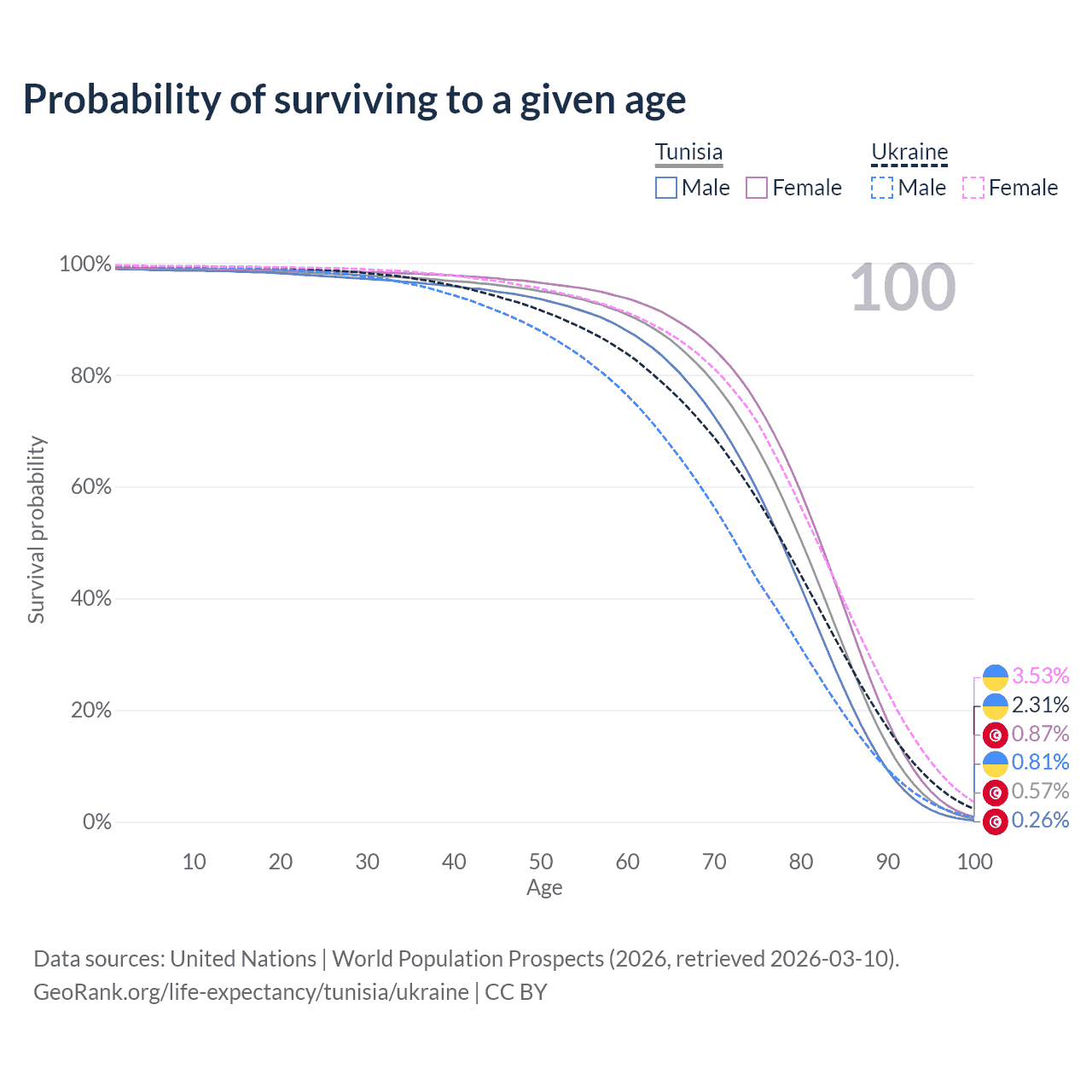This life expectancy calculator shows the odds of living to 100, 95, 90, and below based on current age for both males and females in Tunisia and Ukraine, along with mean and median age of death. The calculations are based on the 2026 life tables (actuarial tables) from the UN World Population Prospects.