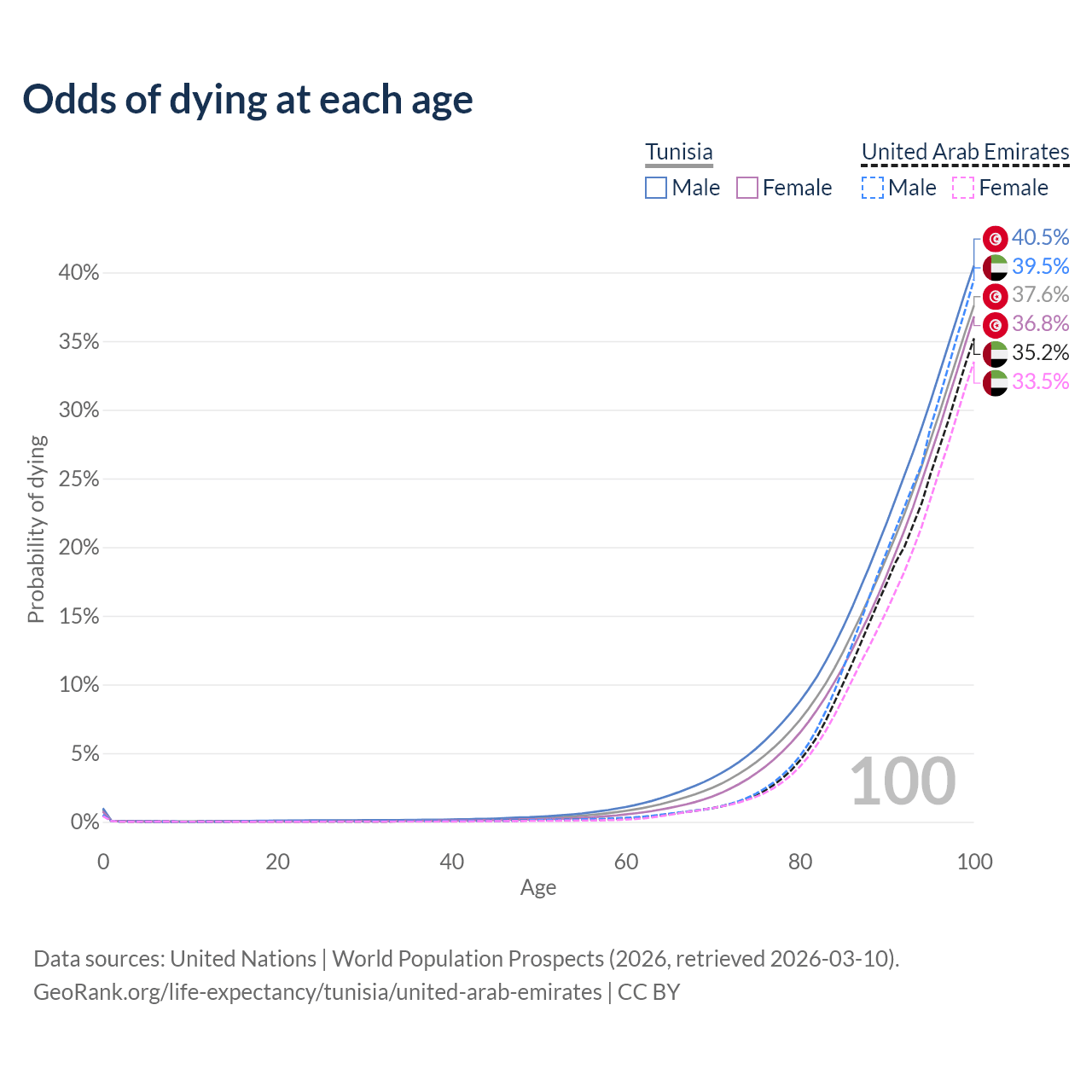 This life expectancy calculator shows the odds of living to 100, 95, 90, and below based on current age for both males and females in Tunisia and the United Arab Emirates, along with mean and median age of death. The calculations are based on the 2026 life tables (actuarial tables) from the UN World Population Prospects.